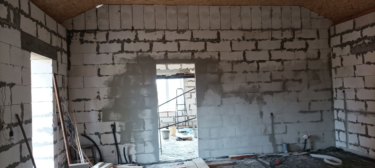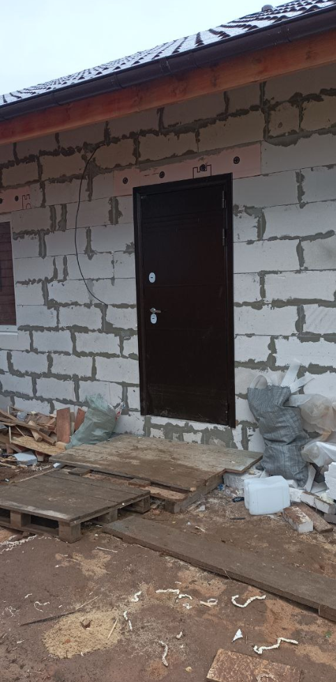 Я слегка охуел, честно говоря, но результат начинает выглядеть домом, чему я очень рад. Из ближайших дел — воткнуть стеклянную дверь в мастерскую (которая уже есть), купить и поставить входную дверь на длинную сторону, собрать каркас и зашить ворота (там всё просто, по кровельной технологии: каркас из пятидесятки, в него 200 мм утеплителя, изнутри пароизоляция и ОСБ, снаружи гидроизоляция, контробрешётка и тот же ОСБ. Оставлю небольшие вентзазоры снизу и сверху, которые закрою сеткой, ОСБ сам заштукатурю). После закрытия контура фазу чернового ремонта считаю законченной. Начнём отделку.