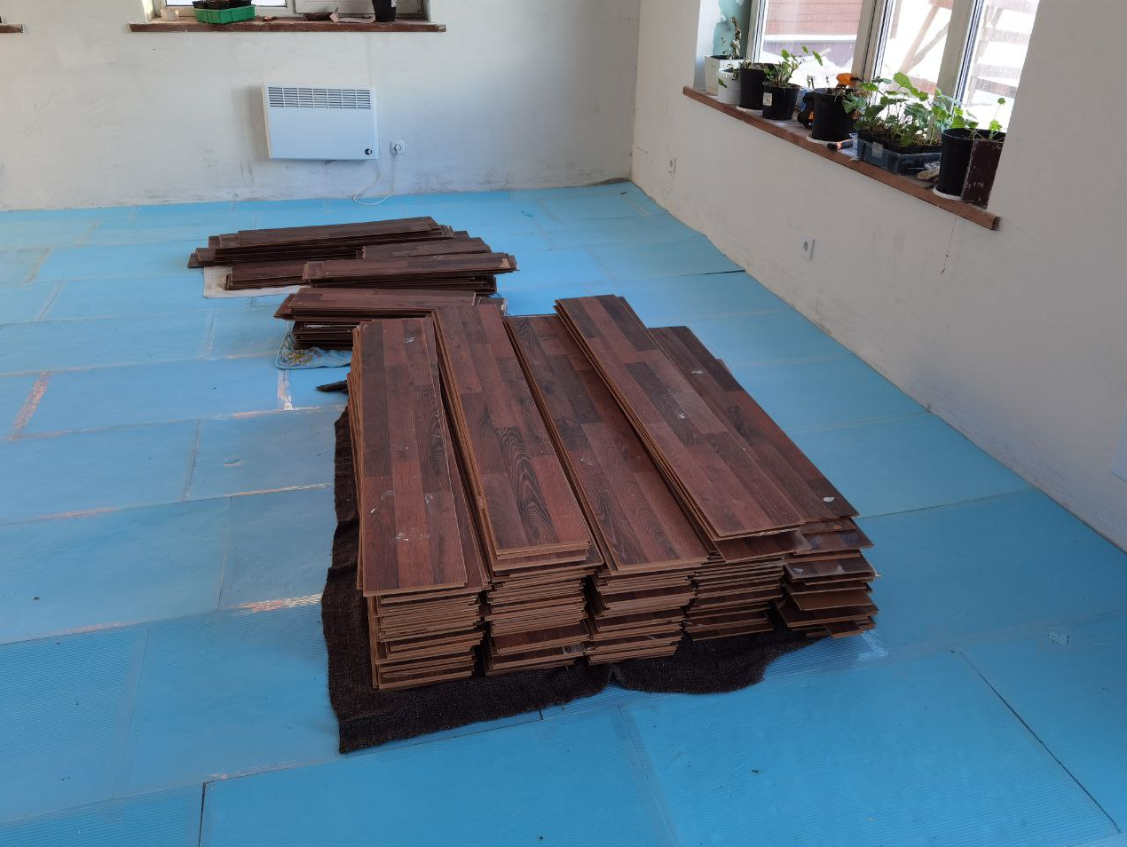 Подложка лежит (тоже бесплатная), ламинат перетащил в дом и рассортировал (целые отдельно, обрезки отдельно). На большую комнату точно хватает, даже если обрезки не задействовать, а с ними ещё и коридорчик между временными комнатами закроется. Жду следующих выходных. Супруга пока на неделе будет красить стены. Короче, работаем потихоньку.