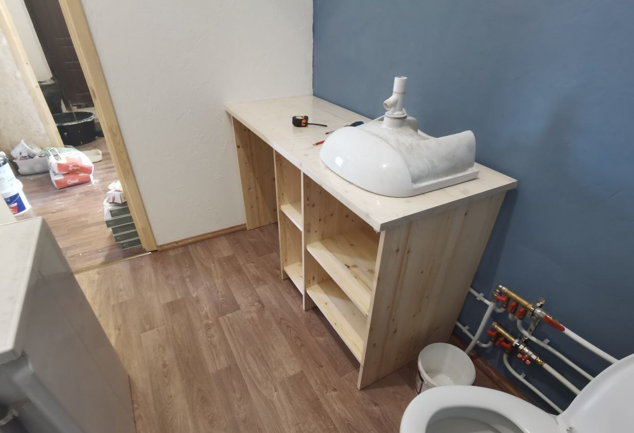 На выходных сварганил из мебельного щита вот такую тумбу в ванную комнату. Слева спрячется стиралка, справа раковина и полки под нет. Дверцы пока не делал, это ещё кондуктор надо докупить для врезки петель, не знаю, насколько я хочу заниматься этим прямо сейчас. Не самая важная часть работы.