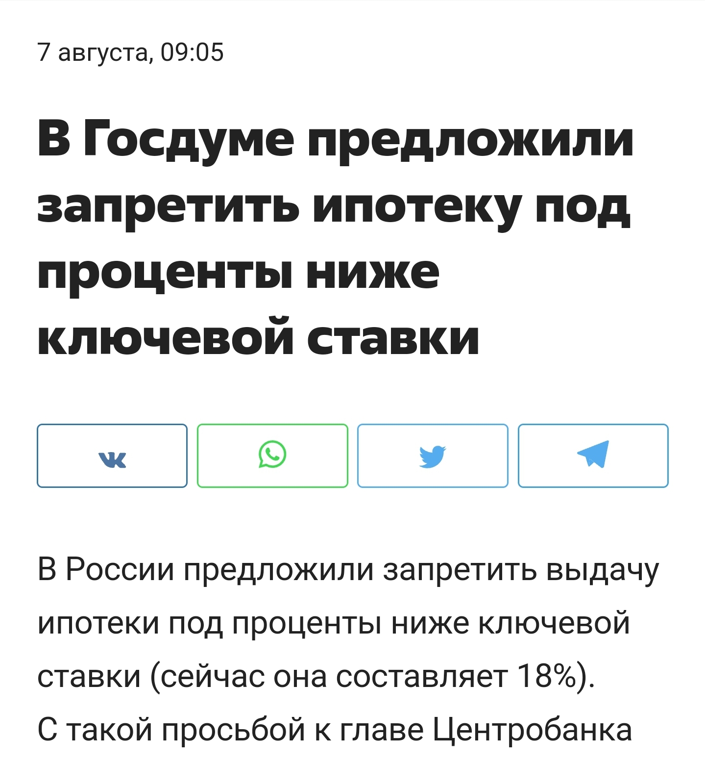 >Получается вообще грустная ситуация Если отбросить твои фантазии, то реальность уже в сентябре вместе семейной ипотеки, будут давать деньги потому что ставка Ахуеть какая, и денег будет хватать акурат на первый взнос самого дешёвого пиковейника, ну может 30% пв, но не под 6% а под 22% и программа вроде как есть и деньги тоже, но платежи будут по 80+ в месяц что сам понимаешь, дороха Все мутки с льготными ставками на 2 года прикроют вообще. И пизда новостройкам и застройщикам, как раз крупные будут терпеть и на жире пережидать мелочь сдохнет А вторичка вообще никого не ебет, она под 16% никому нахуй не нужна по таким ценам, под 22+ тем более, скидки по 30% за нал будут и дичайший боковик до лета 25 года в лучшем случае, целиком надеясь что ставку быстро снизят. Вон выше писали что уже просрочки растут