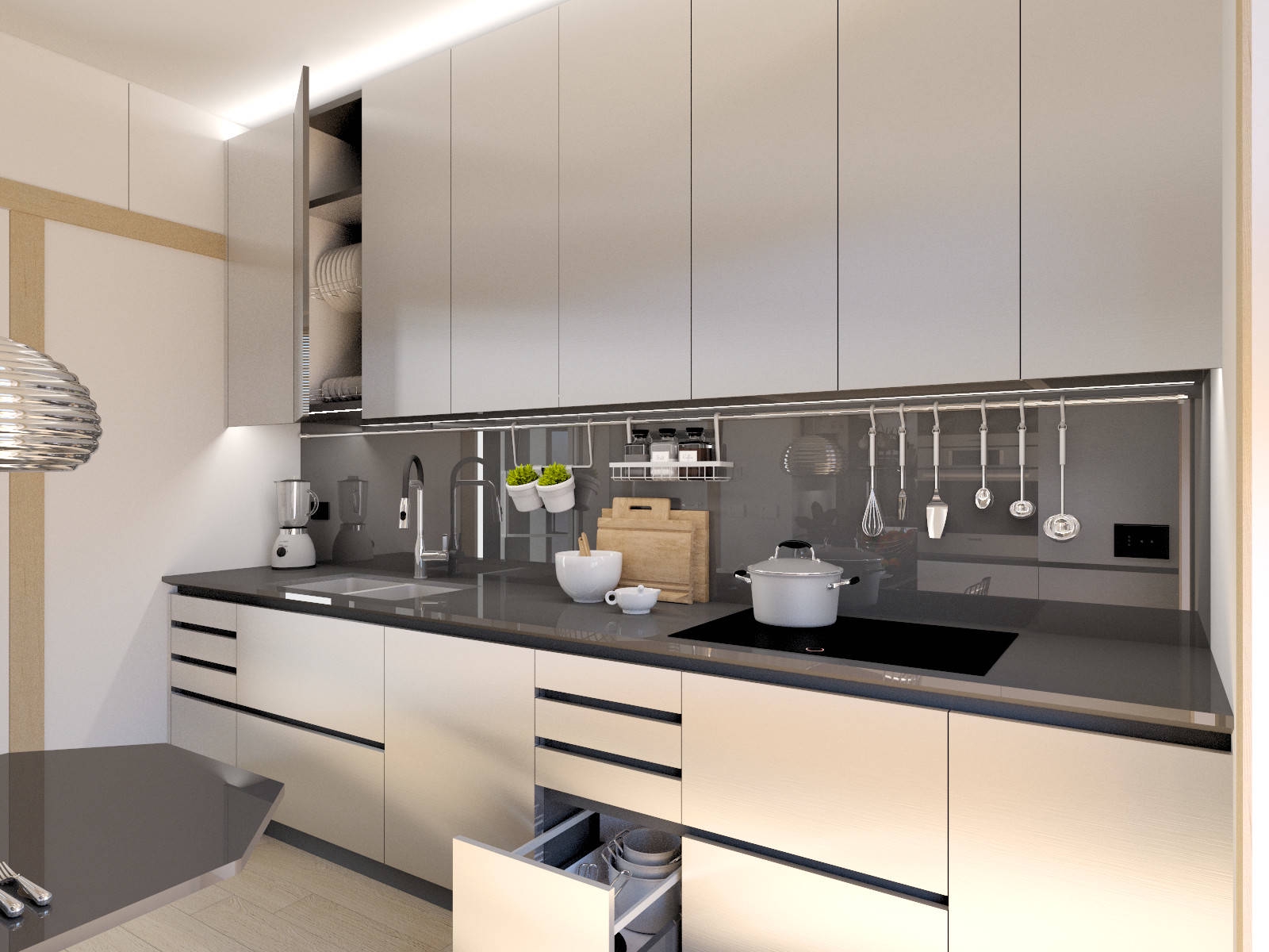 Обыкновенная ручка-профиль, практичный белый матовый пластиковый фосад на дсп в скандинавском минималистичном стиле, не боится ни сколов, ни влаги, ни жара, ни грязи. Петли Hettich или Blum. Дёшево и практично, если не делать верхние ящики с дорогими механизмами, тупо узкие створки в потолок. Дорого - это всякие там резные фасады, прованс, классика, эмаль, шпон. А скандинавский стиль - проще и лучше всего.