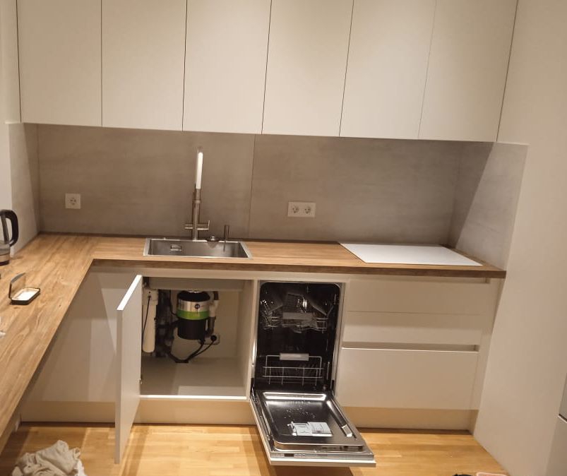 По итогу получилось как я хотел - пришёл, приготовил еды на три дня, прибрал за пять минут, посудомойку запустил. На выходных пройтись спиртовыми салфетками по фасадам и помыть пол. Бонусом идёт большое окно, 1,5х1.5, которое ничто не загораживает и с отличным видом - для него специально купил холодильник с шириной 54см, который стоит в углу, противоположно кухонному гарнитуру.