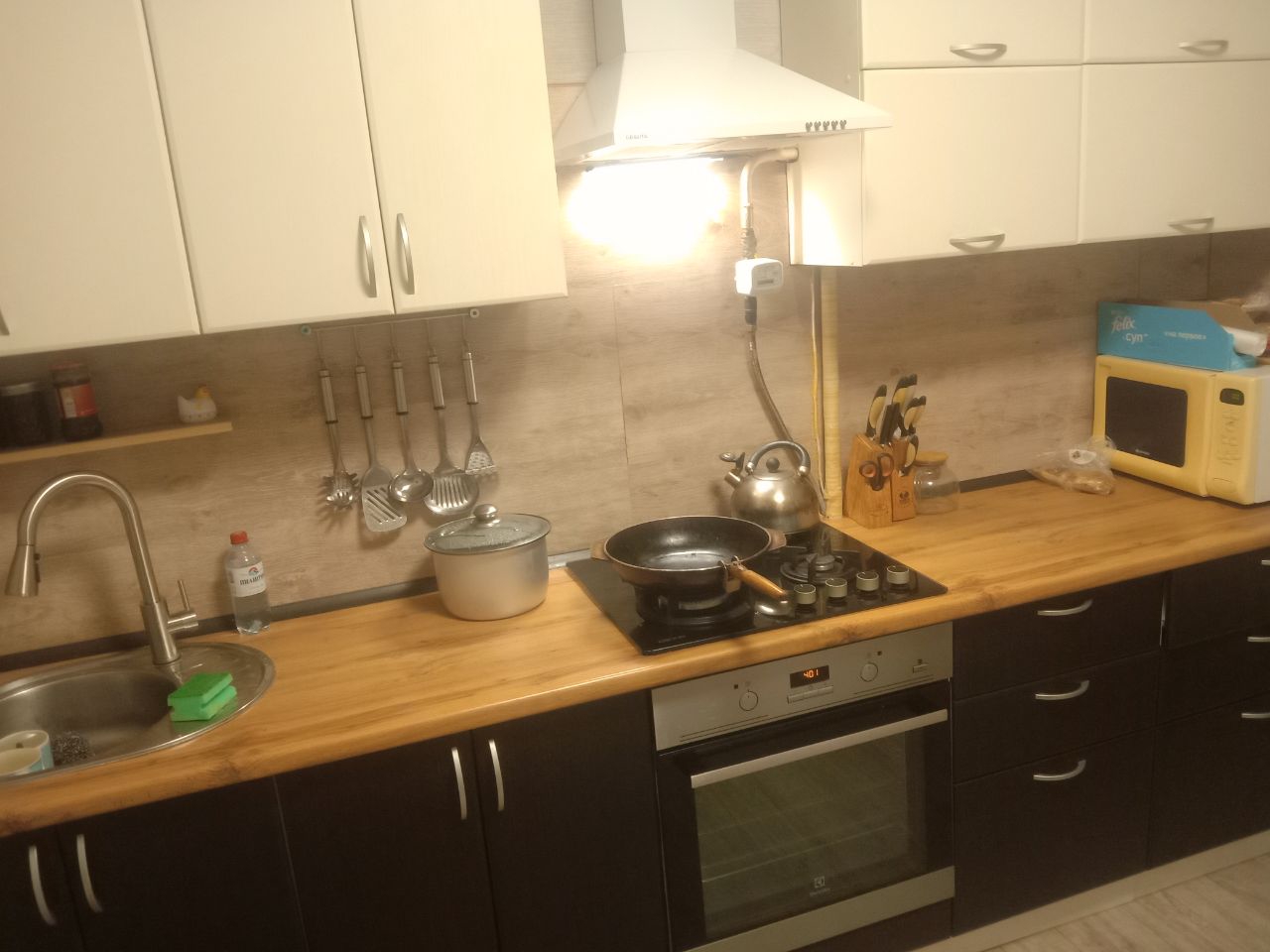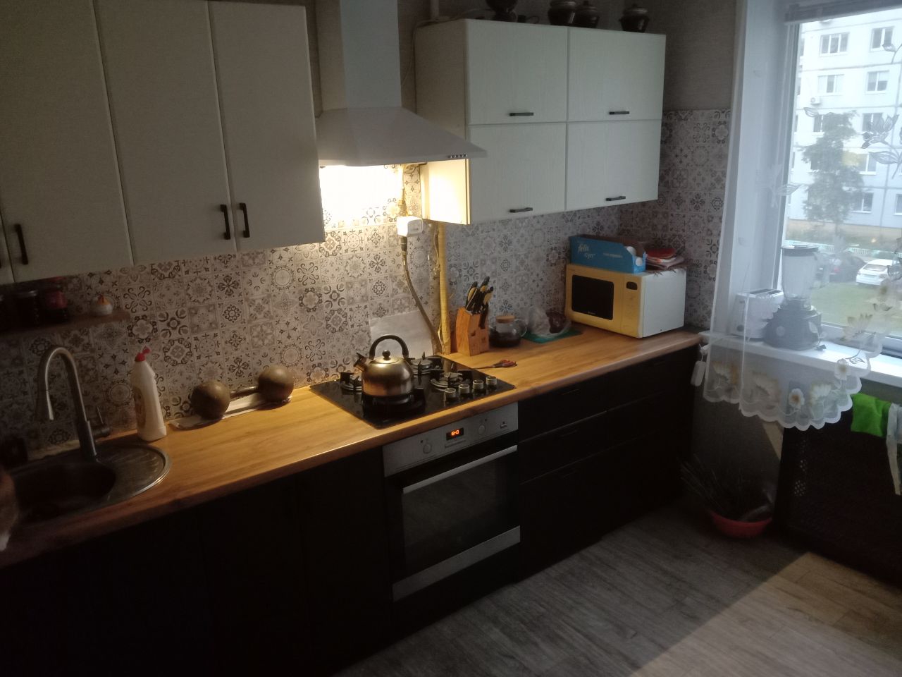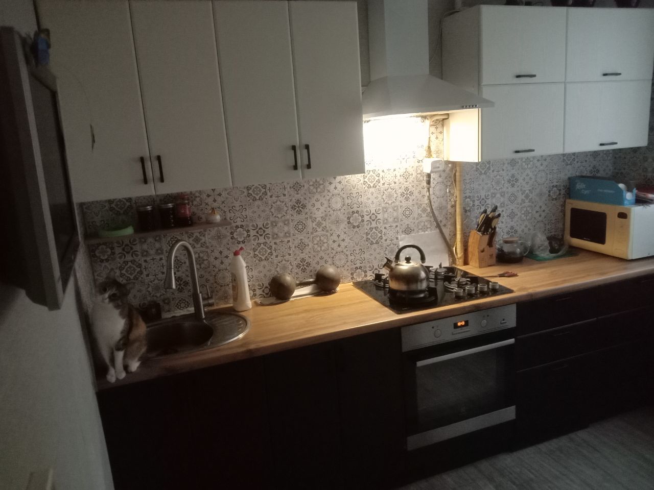 Прохладная. Я заебался с кухнями хрущёвок, поэтому уже в своей квартире приоритет выставил на MAXIMUM PLOCZHAD рабочей зоны, комфорт готовки и скорость уборки. Под нож пошёл обеденный стол и уменьшение количества навесных ящиков. Ах да, газовая труба охуительна, как и трубы отопления. Поэтому сняв старую кухню, прикинув какой пиздец с ровностью всех плоскостей во всех измерениях, принято решение именно красить и стелить линолеум - дешево, практично и сердито. Сердито - это прям про эту кухню.