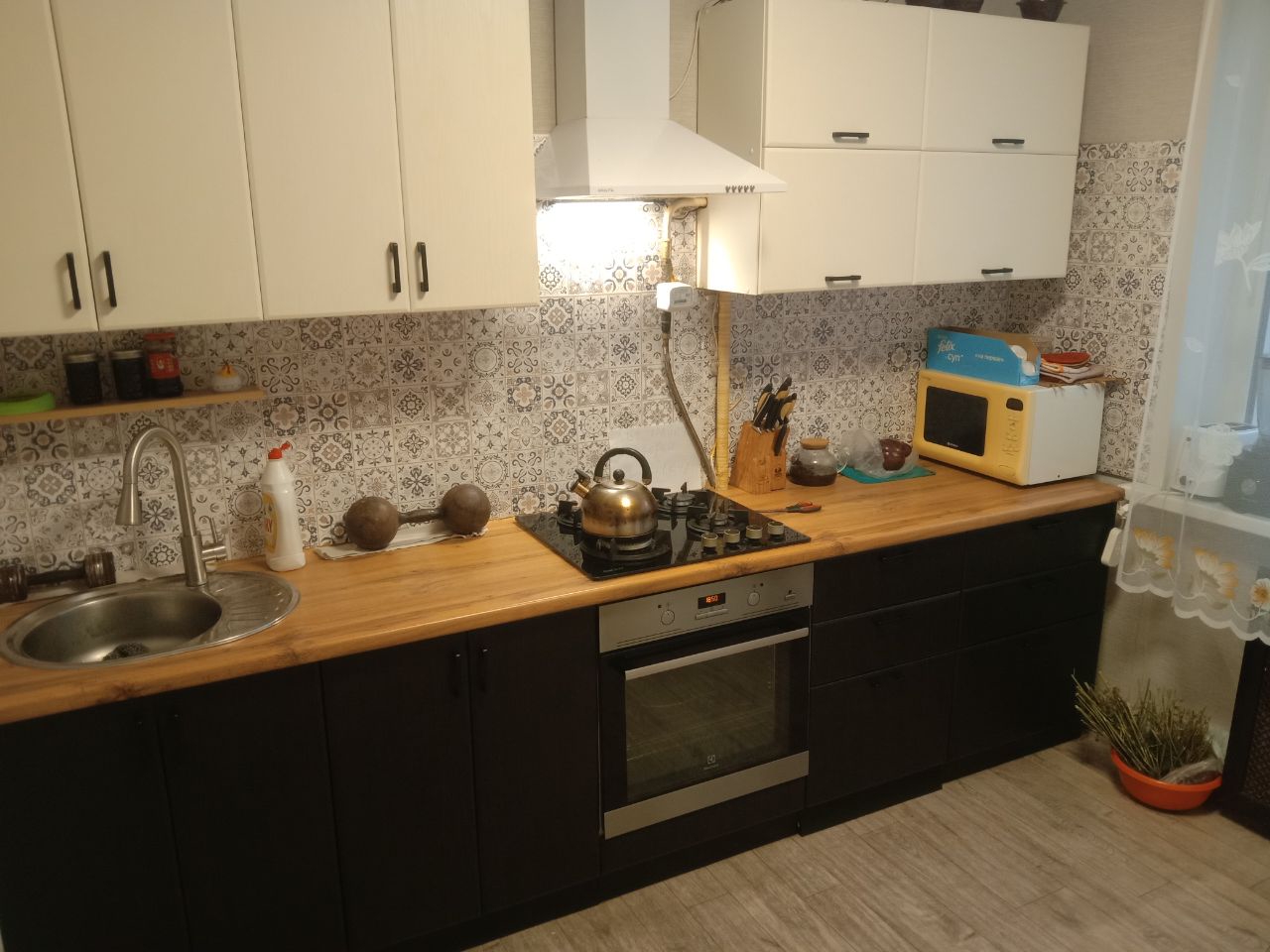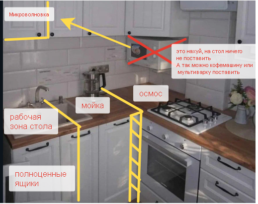 Минусы тоже очевидны, но на такой площади и с таким бюджетом не разгуляешься: -нет места для приёма пищи. Похуй, я в хрущёвках никогда на кухне не ел. -мало мест для хранения. Похуй, всё что нужно спокойно помещается и в такой объём. Можно было бы навесные шкафы под потолок, но там перепад >5см, поэтому поставил стандартные 75см.