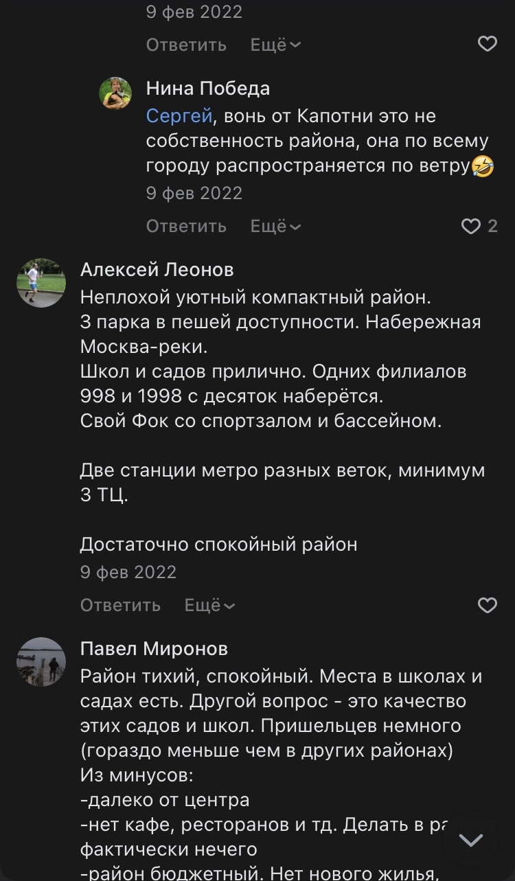 >>365433 >в Пердеево открыть ресторан Там достаточно ресторанов >сменить провайдера на тот, у кого работает ютуб и инстаграмм Провайдер ни при чем >в Пердеево открыть театр или музей Нахер не нужно, любитель попилить бюджетно бабло уровня зима / весна / лето / осень в Москве, Здоровая Москва и пр. итт >не чувствовать запах вони от НПЗ? НПЗ от них далеко, это проблемы гетто уровня Капотни и Котельников, гугли РОЗУ ВЕТРОВ >прокат яхту в Пердеево >Как это поможет взять на прокат яхту в Ясенево? >добираться до центра менее чем за час? Без пробок или на метро - запросто >не слушать грохот от депо "Южная"? ПВХ-окна на что?