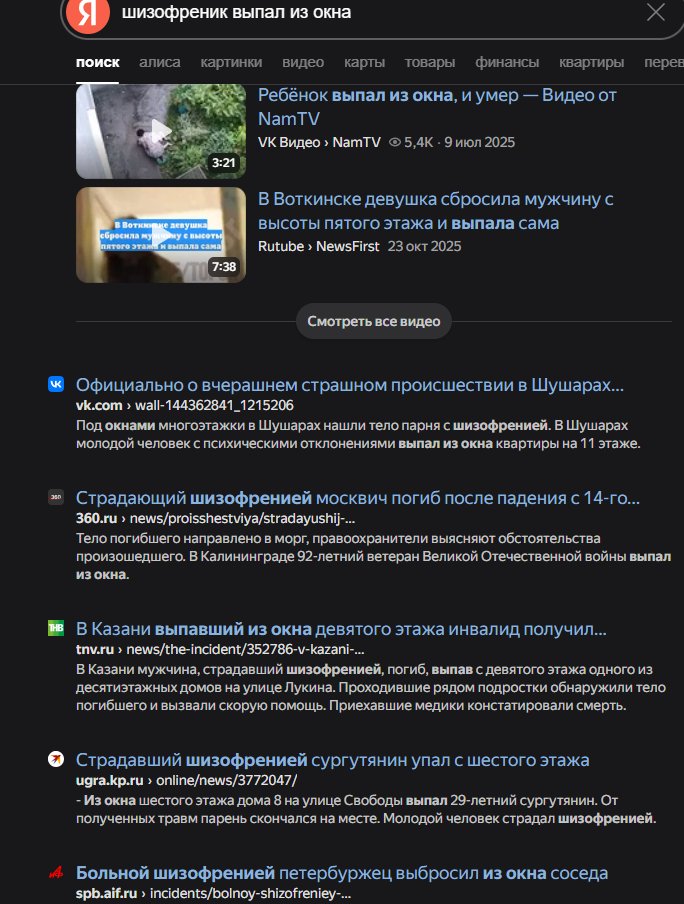 >>375729 Пиздец, у тебя мозг работает. Сам обозвал шизами лишь по той причине что сам не сталкивался с подобным. Ни у одного из присутствующих нет признаков этой болезни, они только в твоей голове. Загуглил шизофреников, падающих из окон. То есть пруфанул свои же домыслы. Вот когда найдёшь череду новостей, что человек жаловался на шум соседей сверху, потом спрыгнул из окна и оказалось что у него справка - тогда и приходи. А пока это низкоинтеллектуальные аргументации залётного петуха-фантазёра. Свободен.