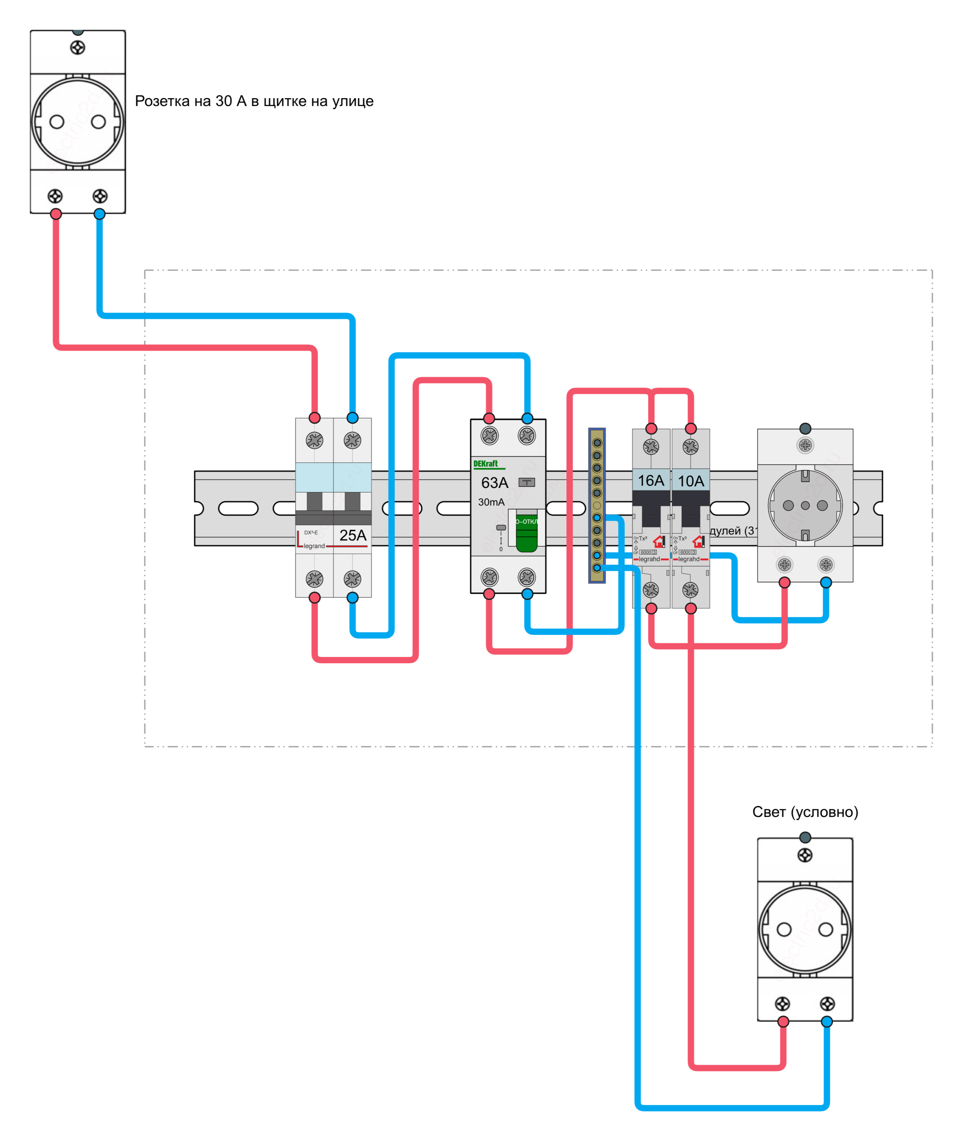 Планирую собрать щит на даче, пока самый простой. Все автоматы класса B. УЗО класс A. Подскажите, все правильно соединил? Есть какие-нибудь ошибки/подводные камни?