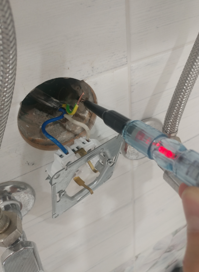 Белый - фаза, синий - ноль. Жёлто-зелёный обычно земля, а тут на ней индикаторная отвёртка светится, при том что розетки ванной выключены на автомате. Этот "земляной" провод крутил так и сяк пальцами, другой рукой держал металлические трубы/ванну, не ёбнуло.