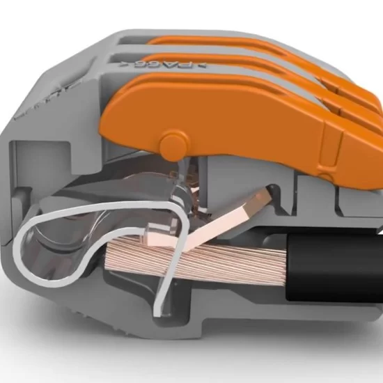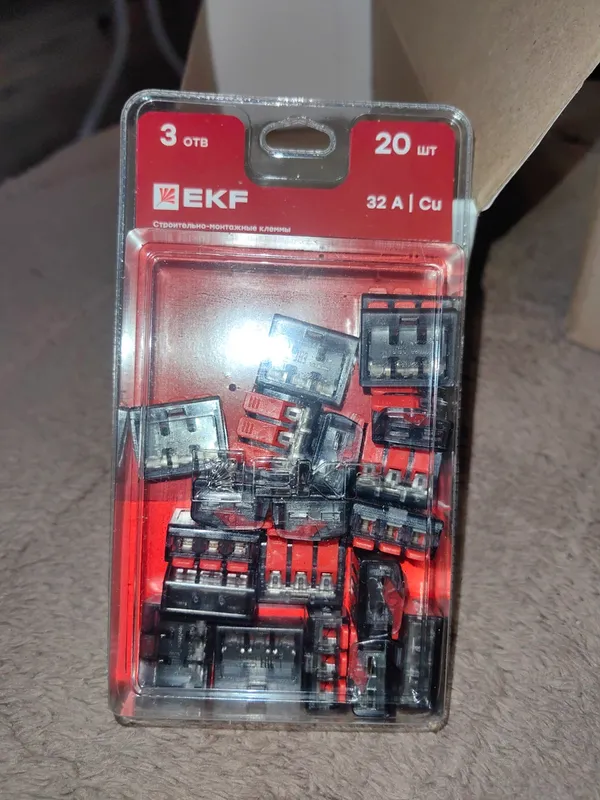 Для сравнения, брал клеммы EKF с тёмным прозрачным пластиком. Никому не советую. Пластик очень толстый, клеммы громоздкие. Пружины слабее и зажимают рандомно, иногда жилу легко выдернуть. Оси рычажков находятся слева и справа от жилы, поэтому многопроволка иногда неудобно втыкается. Какая-нибудь случайная жилка отгибается вбок и цепляется за рычажок. Пару раз её там и зажимало, потом приходилось её выдёргивать из клеммы пинцетом.