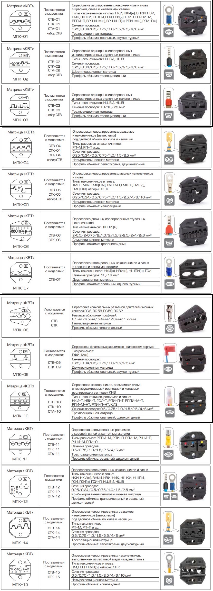 >>381248 > Какие матрицы нужны, а какие никогда не пригодятся? Отталкивайся от того, какие наконечники/гильзы использовать будешь. Что-то вроде всяких НШВИ/НКИ/НВИ/ГМЛ для дома и РП/РПИ (возможно ТМ/ТМЛ еще под какие-нибудь силовые кабели) для авто