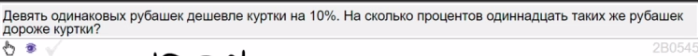 https://self-edu.ru/ege2022_base_30.php?id=16_20 Условие: "Девять одинаковых рубашек дешевле куртки на 10 %. На сколько процентов тринадцать таких же рубашек дороже куртки?" Решение: Девять рубашек дешевле на 10%. Ну типо уравнение принимается за куртку, поэтому берем куртку за 100%. Тогда 9 рубашек в сравнении это 90%. Тогда относительно этого пропорционарирования. 1 рубашка это 10%. Зная единичный коэффициент за 1 рубашку мы можем найти коэффициент за 11. Это 110% И можем найти разницу, что и является ответом. 110% - 100%. ответ: 10%