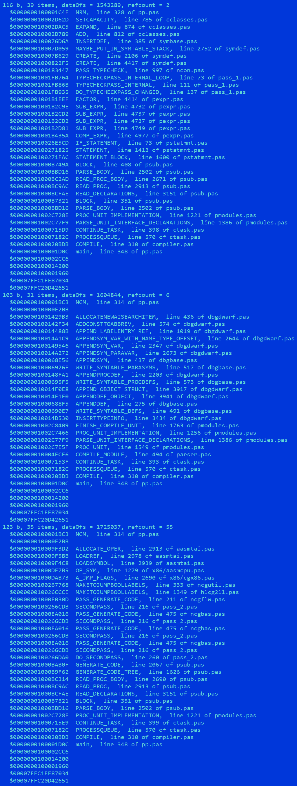 Чтобы поставить точку в этом вопросе, я скомпилировал FPC самим собой, скомпилированным с heaptrc, и в момент пикового потребления памяти вывел полный отчёт по внутреннему состоянию heaptrc — 2,2 Гб и 42 миллиона строк текста, которые внимательно прочитал в течение пяти лет (32-битный Notepad++ отказался это открывать, а если бы и открыл, он и с впятидесятеро меньшими файлами работает как полное чмо, читал фаром). Этот отчёт подтвердил, что сжатие и дедублирование прекрасно синергируют друг с другом и только совместно позволяют поддерживать комфортную длину трейсов аллокаций, но меня немного расстроило, что он составлялся 54 ёбаных минуты, и всё из-за стандартной функции BacktraceStrFunc, которая превращает адрес машинного кода в человекочитаемый, то есть по левой четверти пика 5 возвращает его правые 3/4.