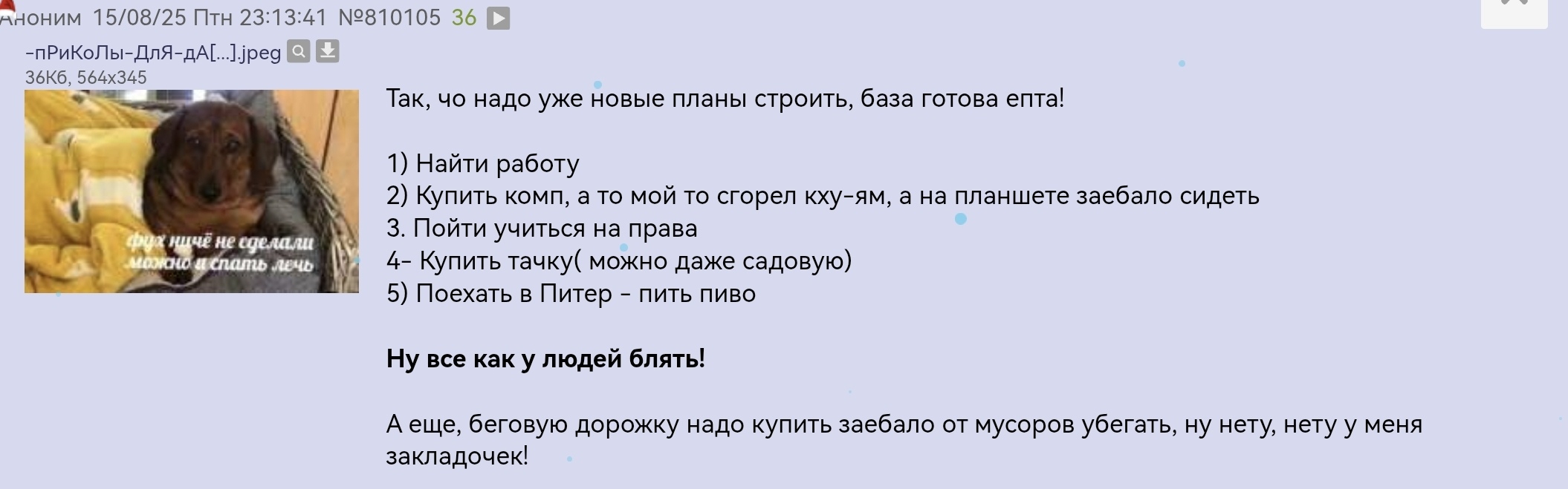 Бля, а чо я чет затроил, надо было новый список планов придумать на этот год, сюда записать Пролистал и увидел что я в августе по рофлу написал, вот он и будет новым списком дел. Ваще п🕯️хуй.