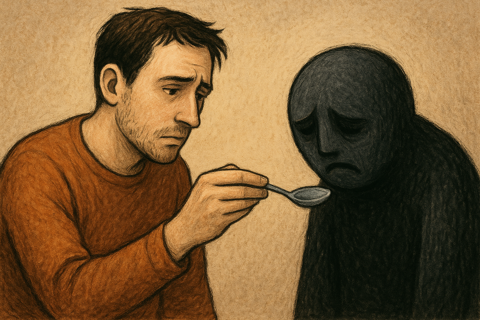 18:16 14.08.25 Мать покормила отца в 10:30, сменив ему подгузник в 9:30. Потому что выспалась, и ей не надо было ходить к своему мужу и моему отцу почти каждый час ночью. А я уже третью неделю не сплю ночью, потому что у отца пролежень на копчике. Он тихо стонет иногда, зовёт мою мать по имени, но прихожу к нему только я. Отец может в 5 часов ночи крикнуть «Больно!». Я спрашиваю у отца, посреди ночи прибегая к нему, о том «где у него болит», а он в ответ говорит «в залу». Я присаживаюсь рядом на кровать,а он вновь зовёт мою мать по имени, даже не обращая внимания, что вот я рядом с ним. Я поворачиваю его на другой бок, поправив всё что надо или иногда сменяя подгузник, смерив давление и дав таблетки, думая что этого будет достаточно. Но он всё равно периодически стонет с разным диапазоном громкости и засыпает. Как водитель в машине подаёт сигнал перед тем как поехать, так и мой отец вначале зовёт свою жену по имени, а потом пьёт из бутылочки, заботливо прицепленной к его футболке.