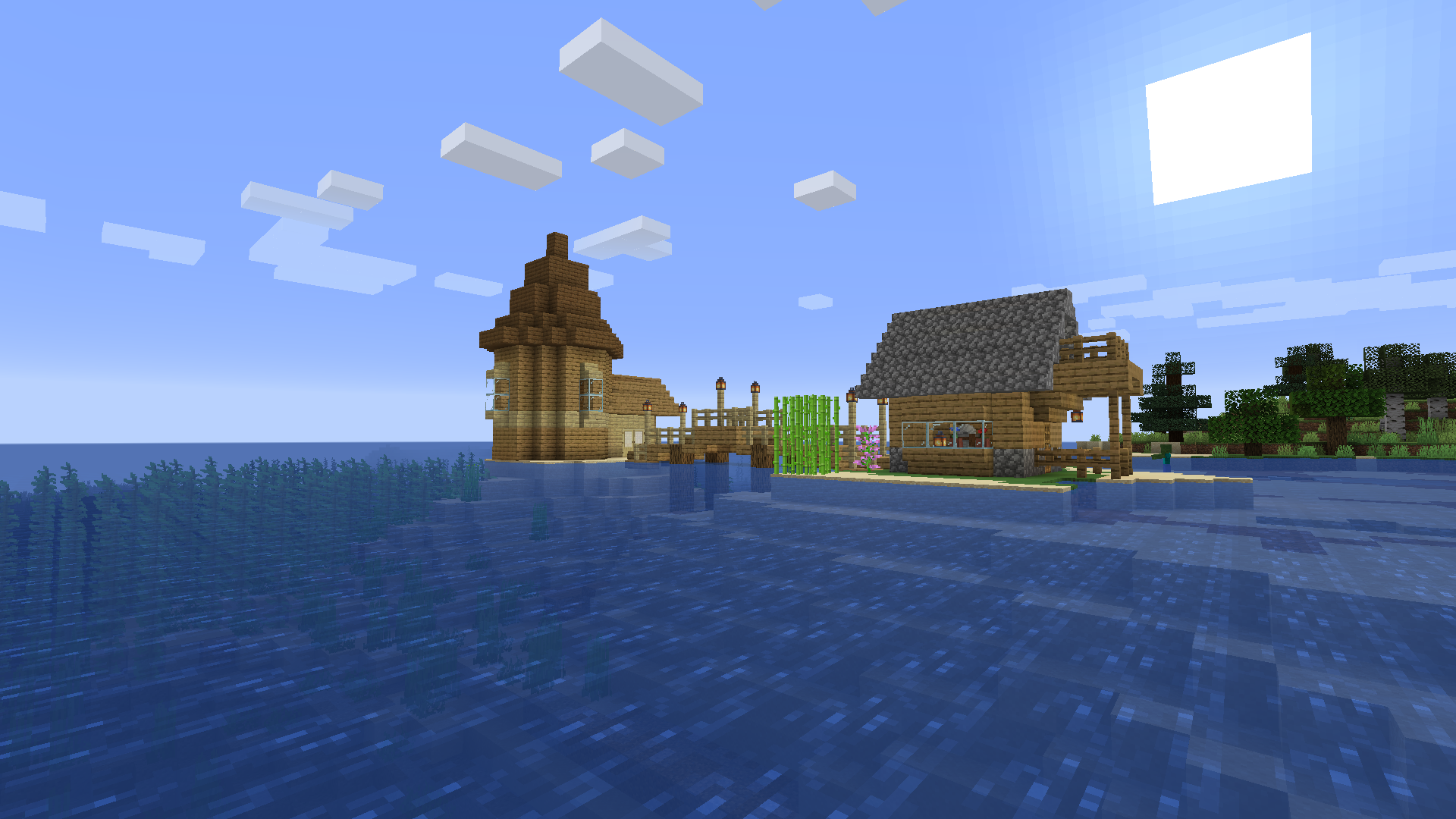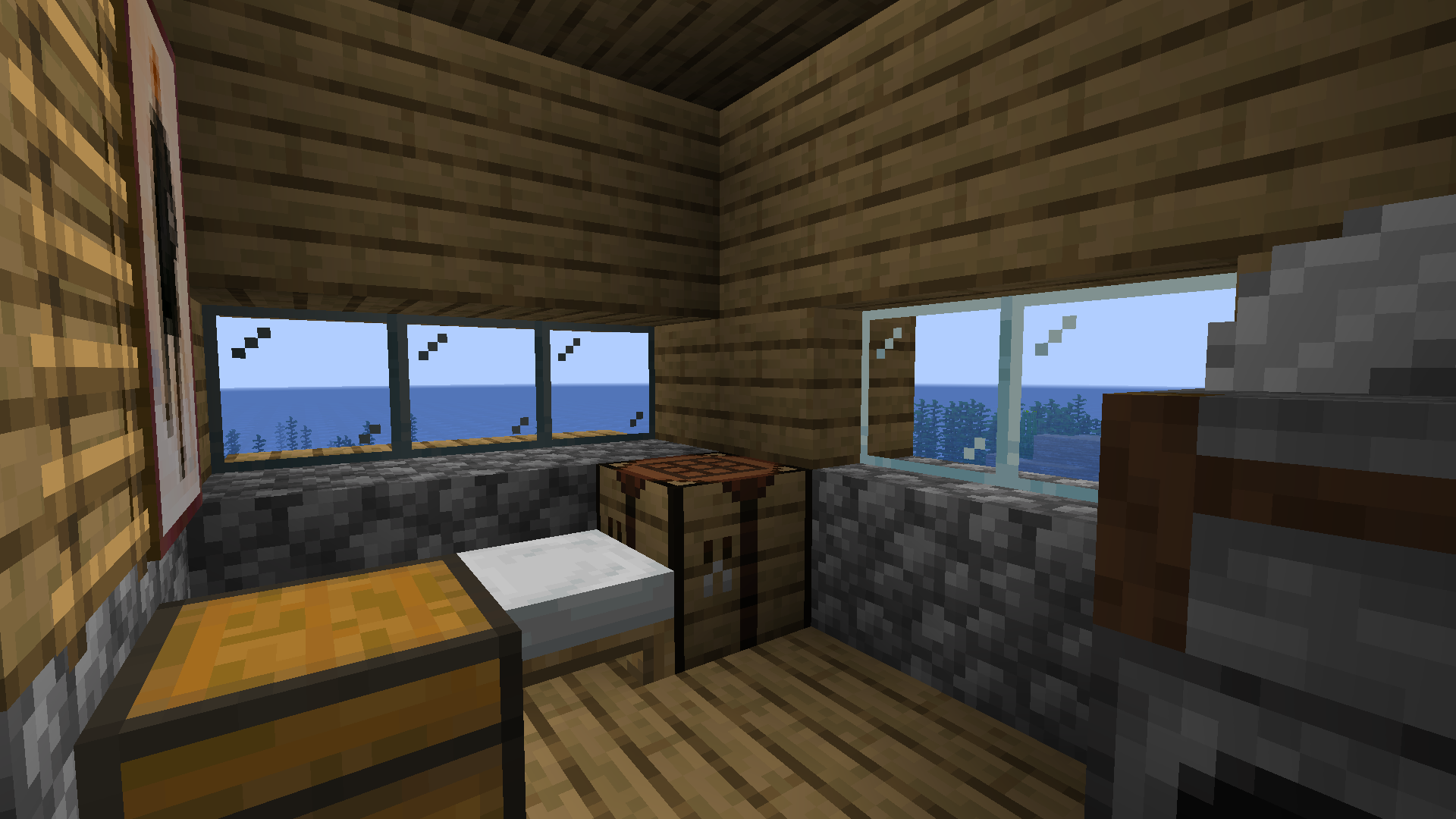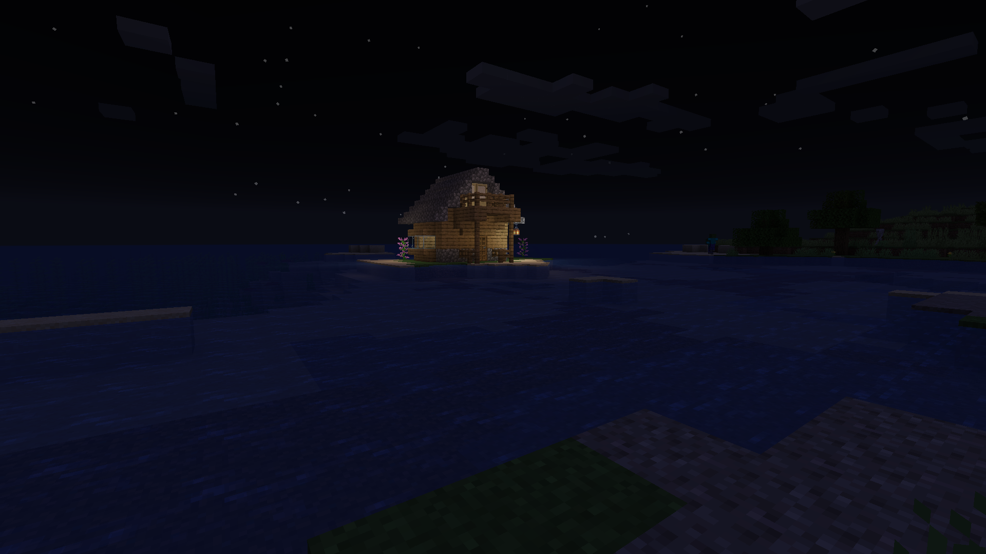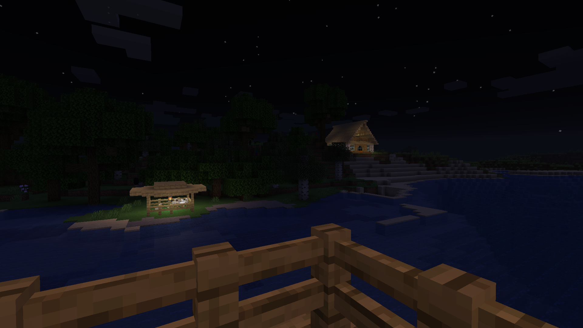 Сделал немного странный домик и мостик, чтобы можно добраться до него. Внутри пока что ничего не сделал, думаю, там будет стол для зачарований. Пока что опять надоело играть, потом как-нибудь продолжу.