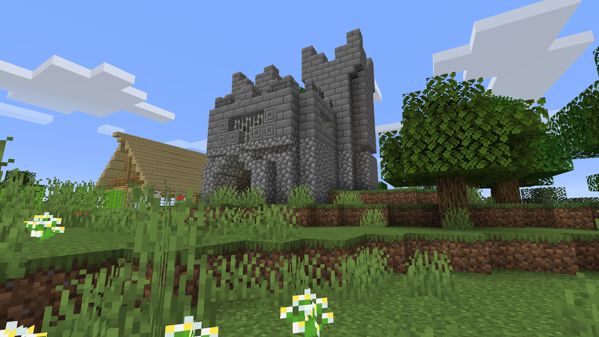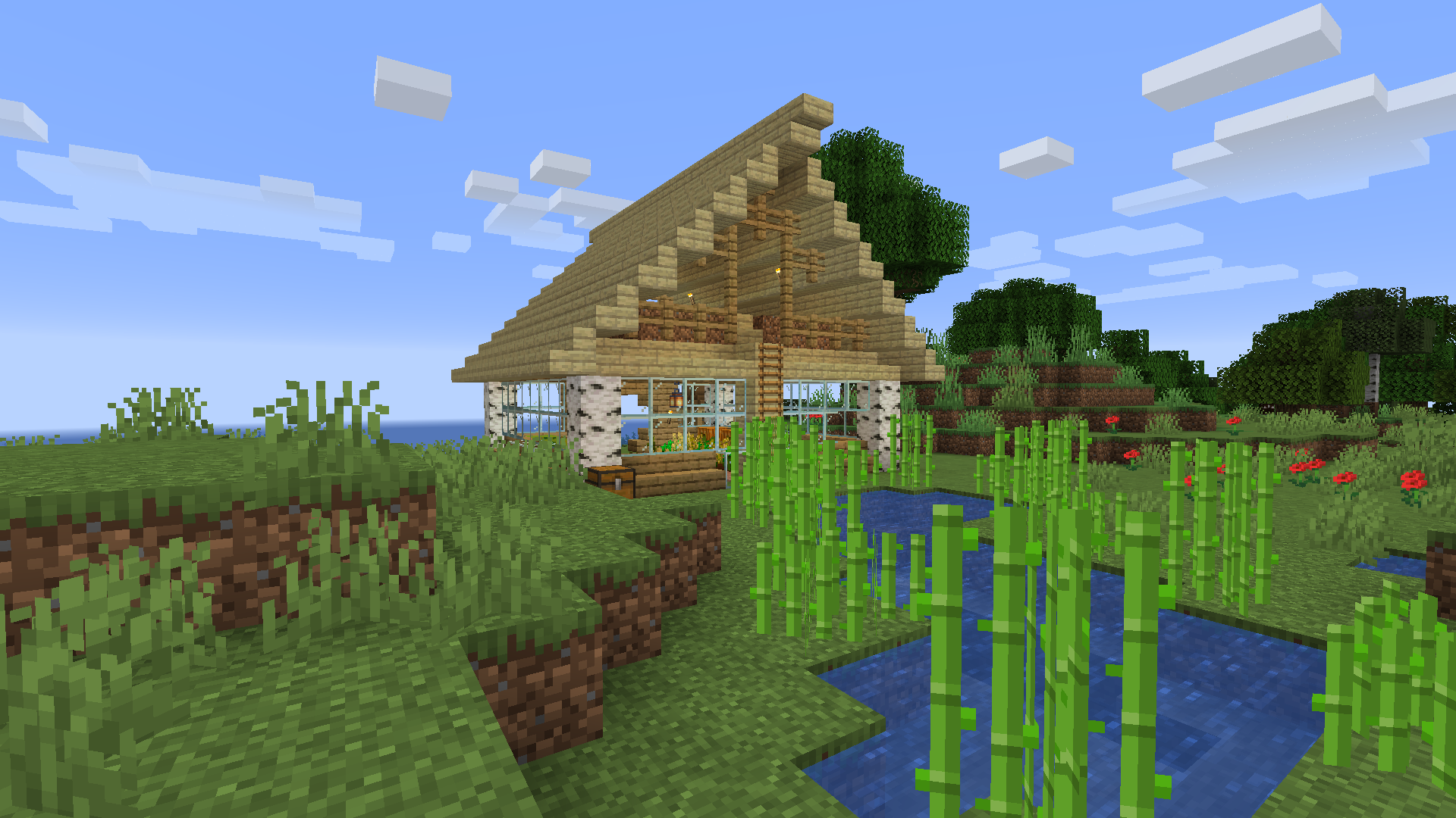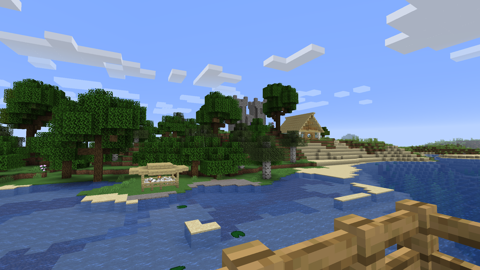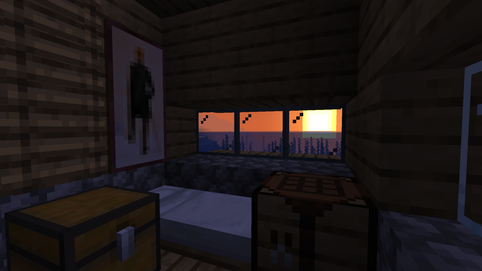 Сделал немного странный домик и мостик, чтобы можно добраться до него. Внутри пока что ничего не сделал, думаю, там будет стол для зачарований. Пока что опять надоело играть, потом как-нибудь продолжу.