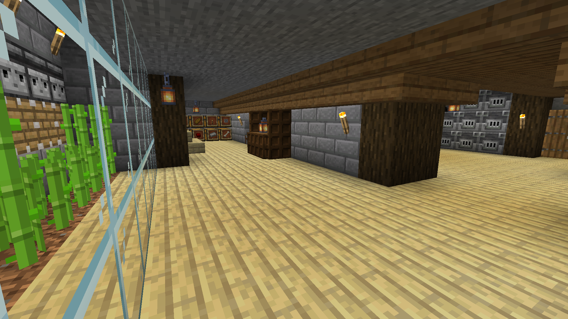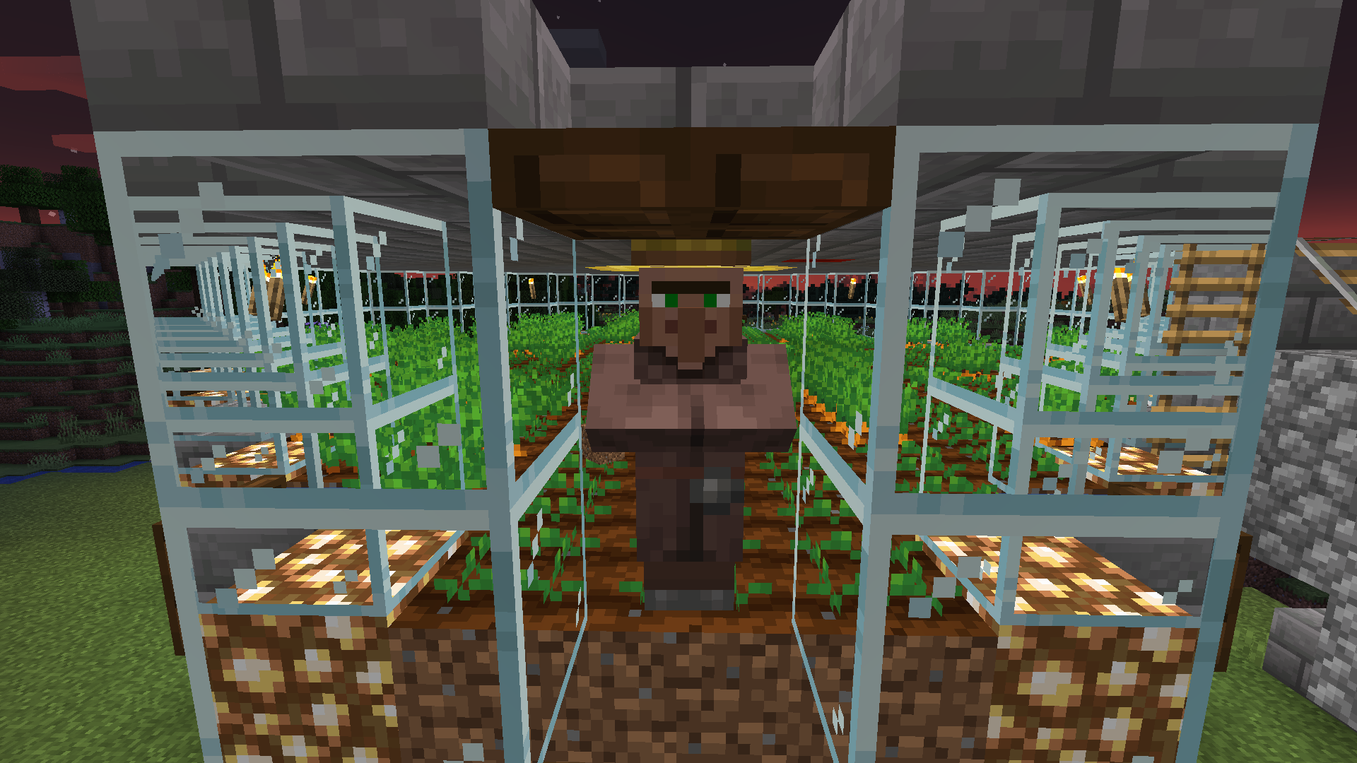 Сделал немного странно выглядящий амбар с застеклёнными стенами на первом этаже и гигантской треугольной крышей, который используется как двухэтажная теплица (представим, что второй этаж со стороны фронтонов можно закрыть, так что внутри будет тепло). И в связи с этим вроде как есть постоянный источник еды в виде тыквенных пирогов, которые делаются из яиц, сахара и, внезапно, тыкв, но, во-первых, надо поставить хопперы под загон с курицами, а у меня закончилось железо, чтобы их сделать, а, во-вторых, пока что курицы дают слишком мало яиц и тыкв тоже маловато.