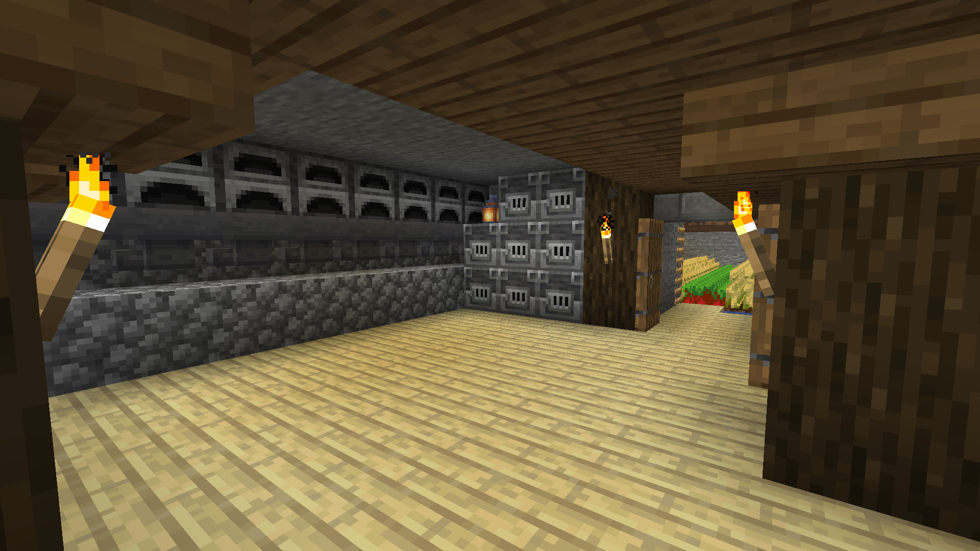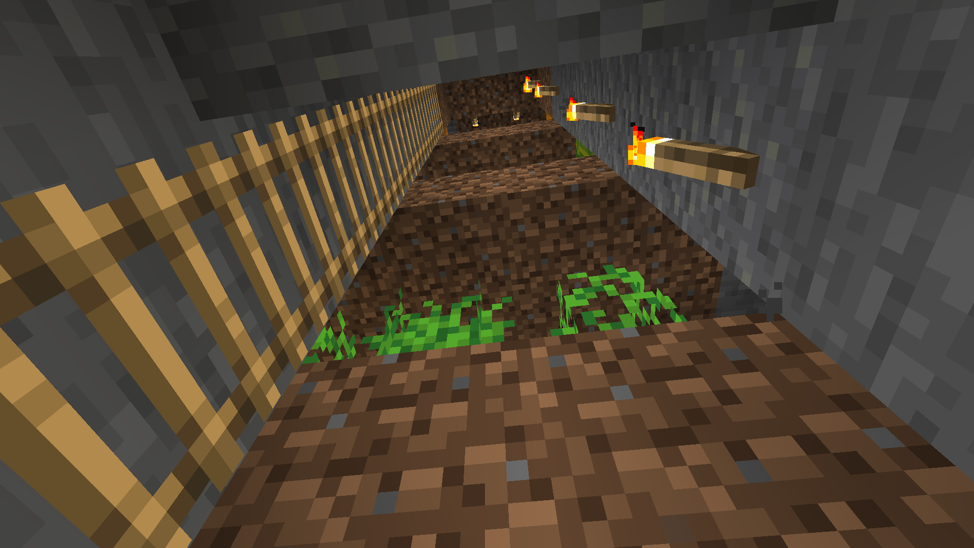 Надо, наверное, сделать подземный этаж амбара, в котором бы было куча тыквенных вот этих растений, чтобы не надо было выносить это всё на улицу. Я бы мог сделать многоуровневую уродливую земляную башню 9x9 блоков в поперечном сечении, где на каждом уровне бы выращивалось бы что-то, но это выглядело бы слишком ужасно, хоть и было бы более-менее эффективно в том числе в плане используемой площади.
