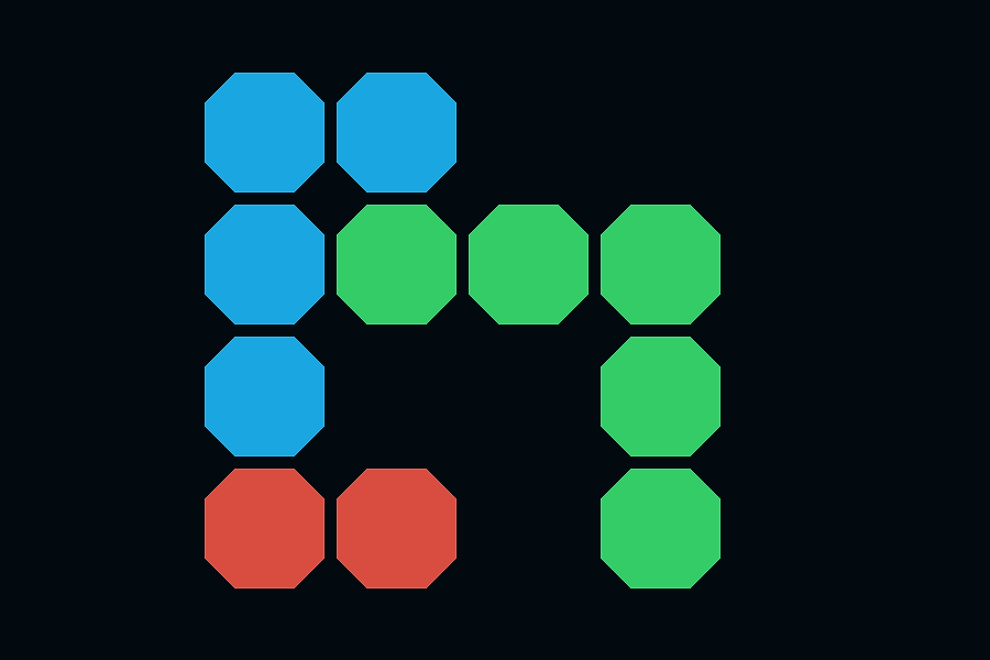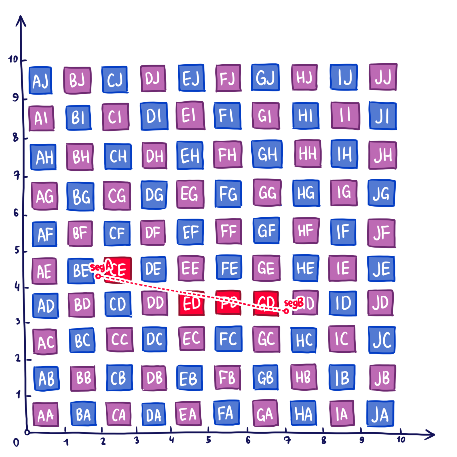 Всё это прекрасно работает в рамках одного RectB, но, когда тестируем коллизии против нескольких статичных прямоугольников, могут возникнуть проблемы из-за порядка, в котором коллизии разрешаются. Допустим, RectA двигается поверх нескольких вплотную стоящих прямоугольников, при этом на него действуют сила тяжести, так что на каждом фрейме вектор скорости направлен наискосок вниз. Если разрешать коллизии в порядке, направленном в ту же сторону, куда движется RectA, проблем не будет, но, если разрешать в противоположном, то RectA начнёт застревать на краях статичных прямоугольников. Всё потому, что он будет сначала вытолкнут в сторону противоположную направлению движения, и только потом наверх, а не наоборот. (Сложно словами объяснить, на картинке понятно.)