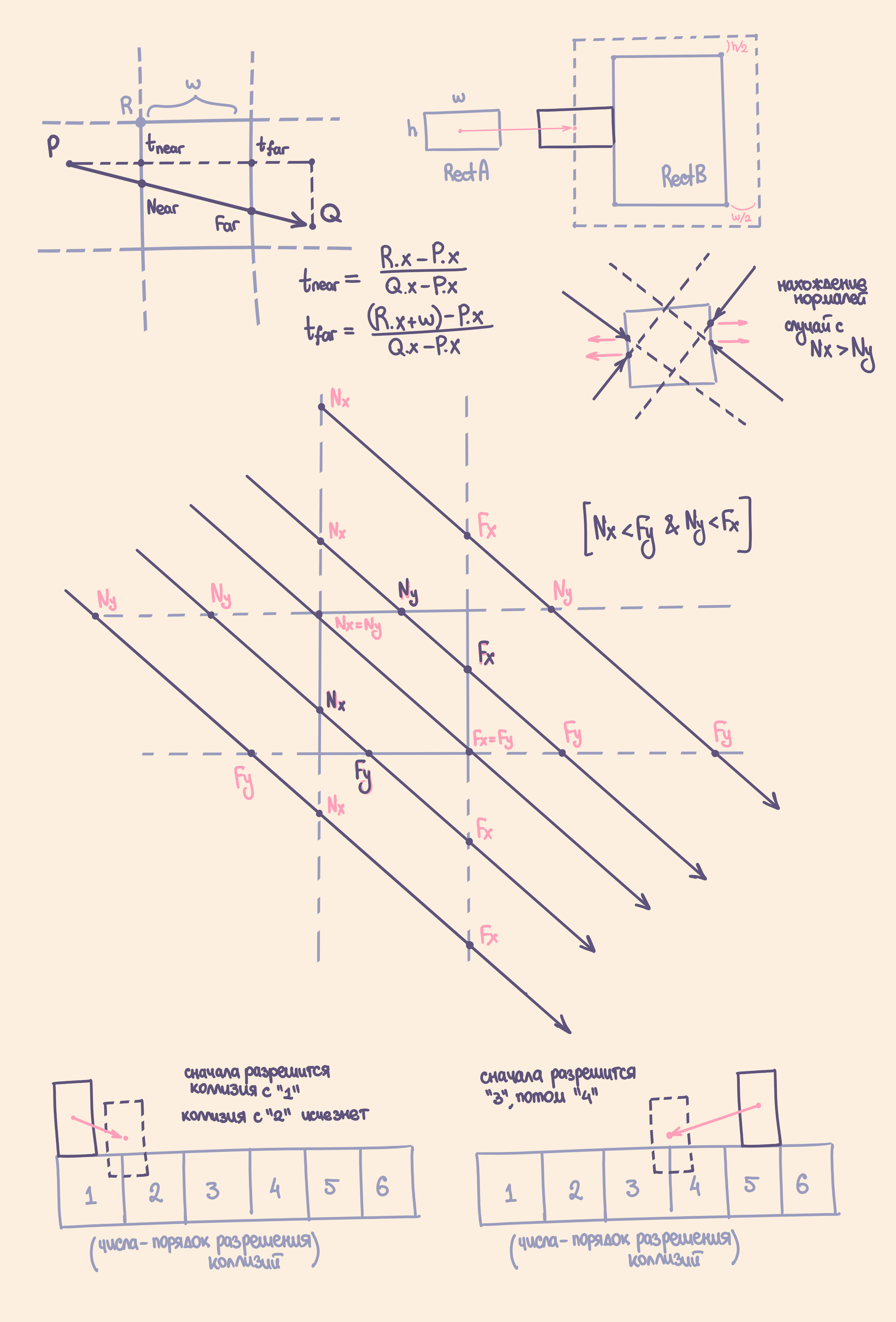 projected rectangle штука Узнал о штуке, которая называется projected rectangle collision или что-то такое. AABB решает проблему пересечения двух прямоугольников, выровненных по осям координат, и при пересечении разрешает конфликт, выталкивая один из прямоугольников в сторону так, чтобы в результате он прошёл наименьшее расстояние, но такой подход может плохо работать на быстро движущемся прямоугольнике: за один фрейм он может достаточно глубоко войти в другой AABB, чтобы его вытолкнуло с другой стороны. И вот эта штука как раз решает эту проблему. Основная идея в том, что имея вектор перемещения, на который прямоугольник сдвинется за следующий фрейм, мы хотим найти точку на нём, в которой движущийся прямоугольник (RectA) ровно прилегает к тому, против которого мы тестируем пересечение (RectB).