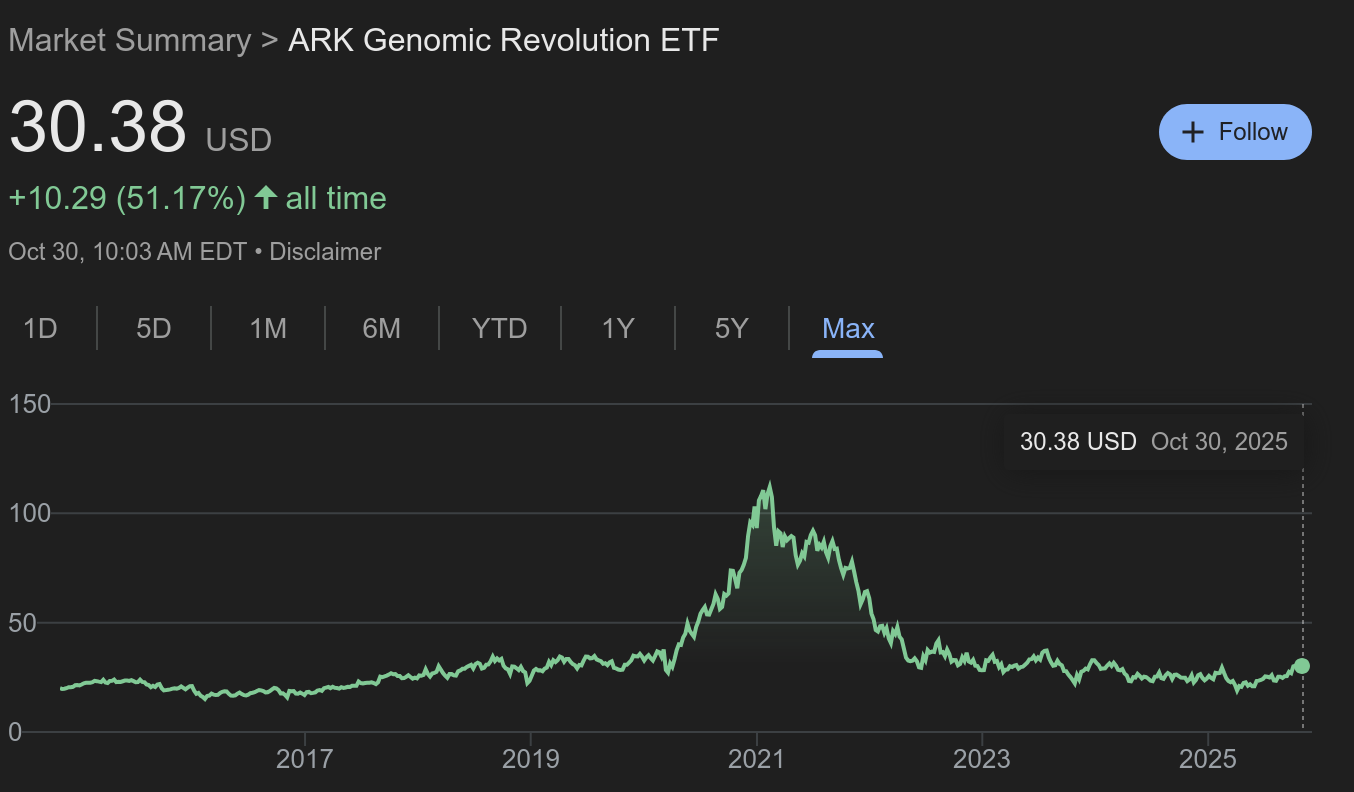 Купил еще 3 фонда: ARKG - геномная революция. Секвенирование, персональная медицина, вот это все. BNDW - мировые бонды. ROKT - исследование космоса и океана.