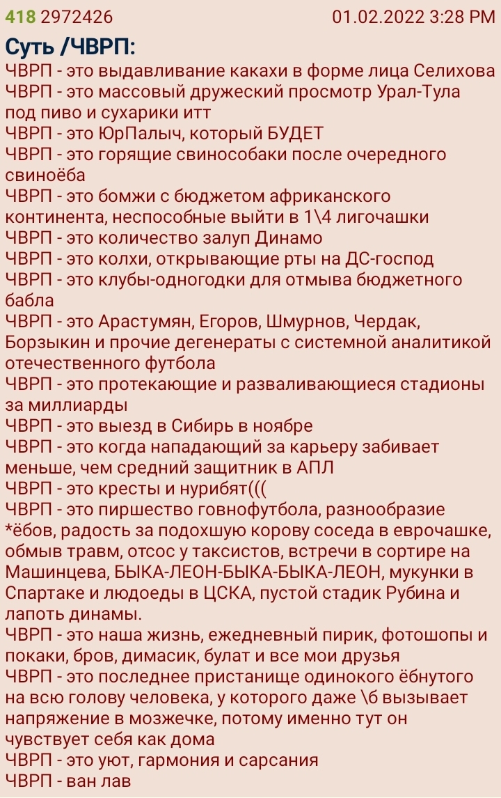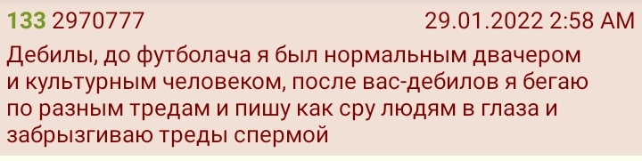 Кстати пару тёплых слов про /ftb/. Доска реально ламповая, особенно когда идут какие то еврокубковые матчи с участием российской команды. Треды дают заряд позитива на всю неделю. С ними я переживал за сборную против хорватов, чуть лиге до слёз. Всей душой радовался ща Спартак, а в частности Селихова отбившего пенальти от Легии. Форсил анекдот про Варди. Доска действительно ахуенная, не обращайте внимание нанабеги шищов сюда, это защитная реакция. Как у маленьких собачек которые тявкают на незнакомых людей на улице, все мы в душе добрые и сплочённые. Заходите туда, не пожалеете