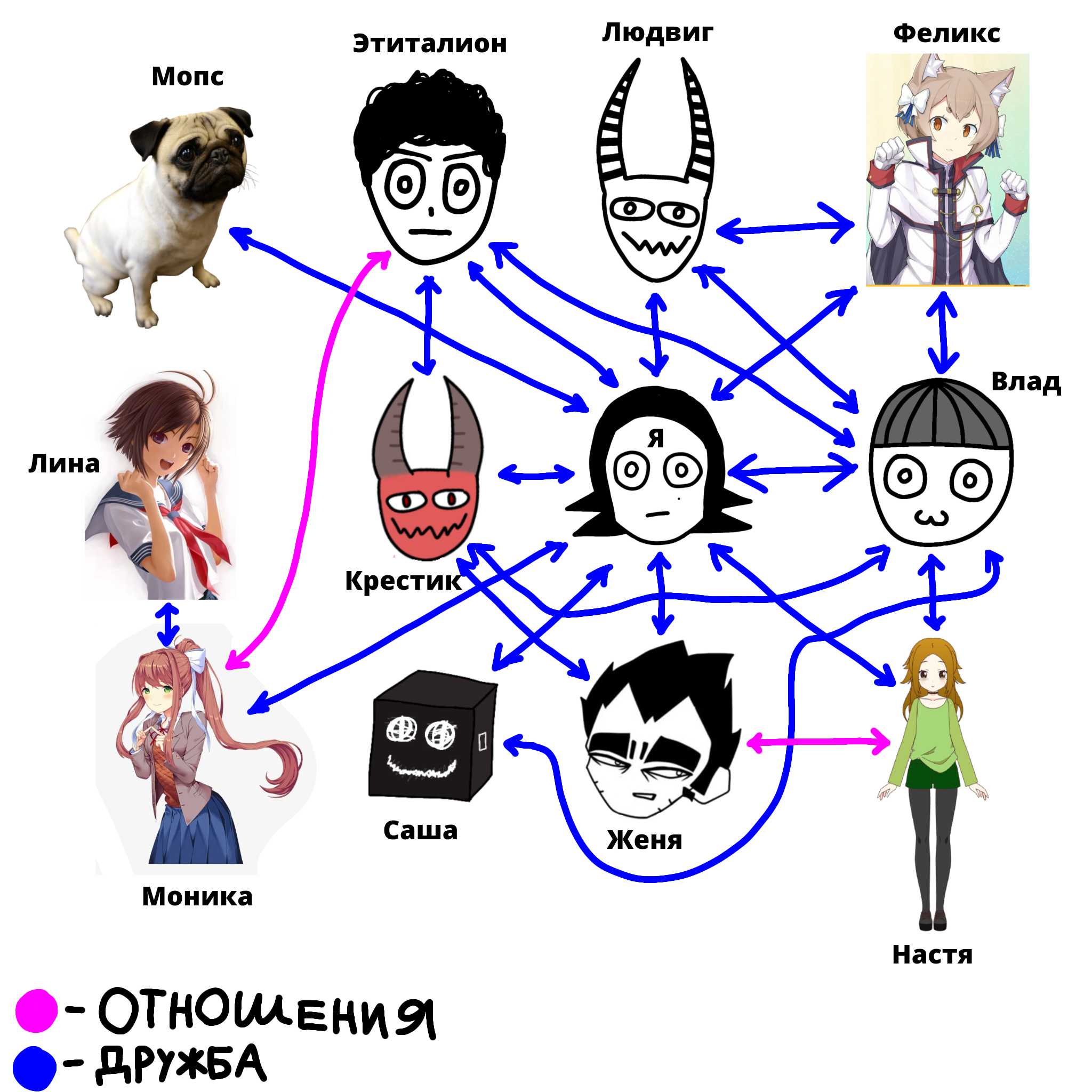 В данный момент я разговариваю в основном с этими пацанами: Влад, Людвиг(хороший демон с которым мы иногда, когда нам грустно сидим на мосту в моей голове), Феликс (имеет анимешный образ одноимённого персонажа из какого-то аниме которое я не смотрел) и Женя (имеет нарисованный образ, часто пьет, один из немногих голосов кто мало знает о моей жизни).