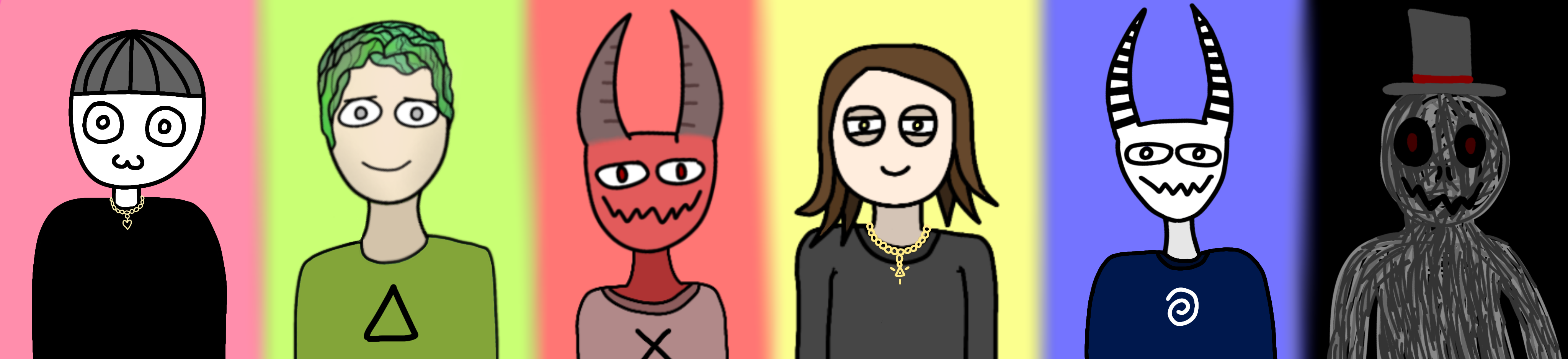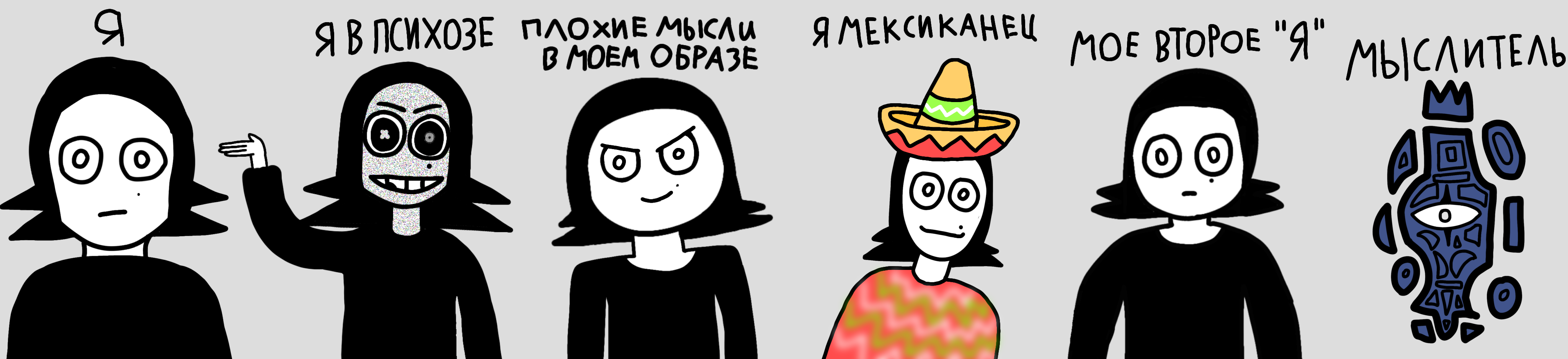Начнем: Влад, Саша, крестик, этиталион, крип, шестой, инь, Настя, Лина, Костя, Борис, мать крестика, брат крестика (большой), четыре младших брата крестика(робот, пташка, и чёртик), экспериментаторы (друзья этиталиона), девка которая пыталась залезть мне в мозг, Айзек, бог, Иисус, мать Тереза, три инопланетянина, культ жемчужины, Феликс, Гавр Гура, потусторонняя мать, крысы наркоманы, говорящий мешок, чёрная дыра, глазастая чернь, суккуб, джабахат, друг Иисуса (главный псевдобог), мопс, забожный заяц, осьминог, руки, тараканы, холодильник, телек, жук, подушка, официант, другой суккуб, принцесса из Марио, межпространственный я, король я, альтер я, я Мексиканец, я серьёзный, я ещё какой то, мини люди, мини строители, другие мини люди, актёр фантазий, мишка, Яша, суки(жизнь жестока), Альтер Влад, еноты крестика, межпространственный совет (помог крестику),дядя Саша, картмен, чуваки из Саус парка, жена дока, док, Рик и Морти а так же их стрёмные варианты, девка-глазик, зловред, девки, девочка лет 9 (говорящий лимонад), Людвиг-Людовик, Локи, Крипи-китайянка, шут, Алёша Попович, Добрыня Никитич, Вельзевул, альтер я (мысли), моршу, Егорка (речи), мой персонаж,судья (Влад всегда прав), мужик из дума, конь Юлий, Донец красный, колыван, инопланетные мухи, спецназ, Рембо, свин(весёлые старты), Стражник, мозг, гиена, поджигательница волос, крипи-незнакомка, Моника, Лицо которое говорит между строк, я в психозе, девка в черных чулках из сна, крик.