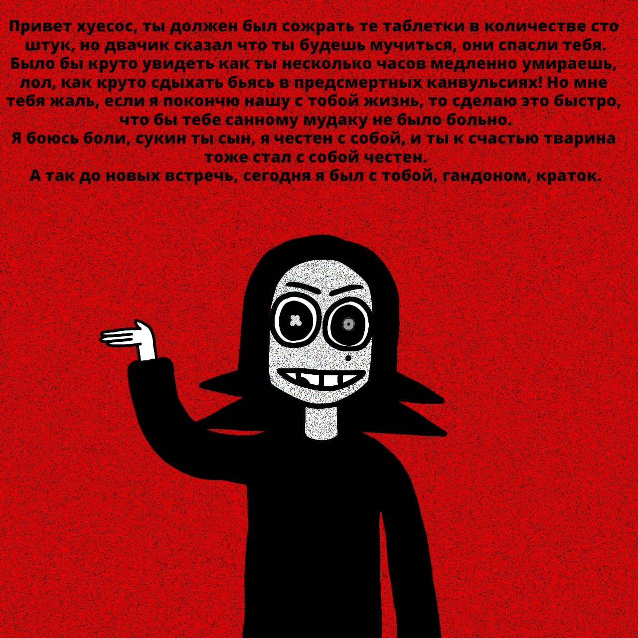 Сейчас эта тварь стоит возле меня и плачется о том что не хочет меня напугать и заебать. Плохие мысли в образе меня это пиздец. Мне не страшно, нет, я привык к такому, меня уже не напугать искажённым кровавым ебасосом. Мои друзья не понимают почему я ему что-то отвечю на его пиздёшь, а я скажу почему. Все его высказывания это просто пустые гиперболизированные даебы, когда же я говорю по фактам о том что он хуесос и то что все это бред - он затыкается. Раньше он пропадал, но сейчас он стоит как вкопанный и давит на жалость.