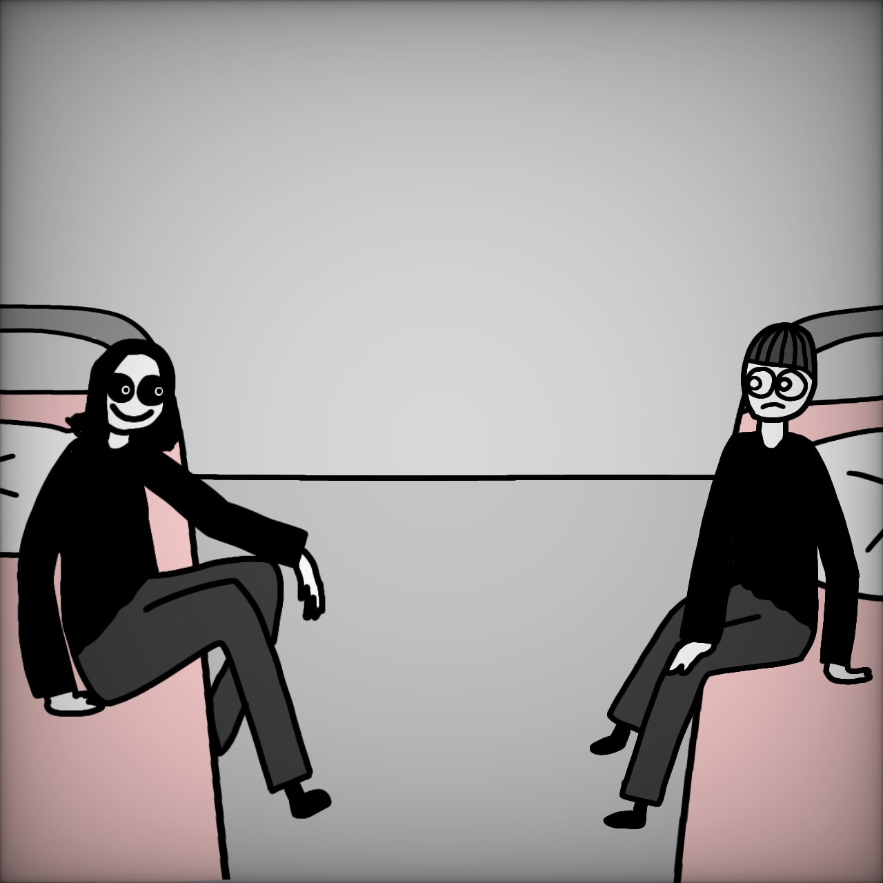 Плохие мысли в образе меня. Это точная копия меня. Подстрекатель и мудак который в последнее время часто появляется. Он не говорит о суициде, он в основном щебечет о том что я делаю что-то не так. Мне кажется что у всех есть такие мысли да ну нахуй!?, у меня они тоже были, но теперь они имеют этот образ.