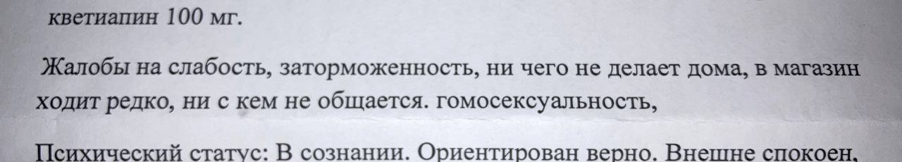 Помнится, в один из первых приемов в этой поликлинике, давно ушедший молодой психиатр расспрашивал про школьного друга, после ухода которого крыша стала течь куда активнее. Он тогда спросил, были ли у меня к нему чувства, не совсем дружеские, и я зачем-то ляпнул, что возможно, хотя их не было. Потом, через некоторое время, он снова поднял этот вопрос, я сказал что склоняюсь скорее к бисексуальности, он такой «хм, компромисс», и больше про ориентацию я ни с одним врачом не говорил. В одном только единственном направлении тот психиатр написал «возможная гомосексуальность», и за пять лет это больше не всплывало, нахуя этот психиатр это отрыл - хуй знает. А пометку «возможная» он, видимо, решил опустить смотря на мои крашенные патлы хех