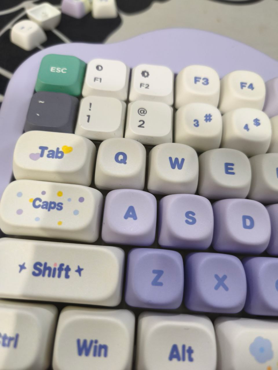 Но пока yunzi с25 + Silent Peach V3 это лучший сэтап. Я так охуел что заказал ещё одну партию таких свитчей, и вот такие кепки типа если я вдруг поеду, я же не смогу с собой взять клаву которая весит полтора кило, нужно найти лёгкий плейт и вставит туда эти кепки. Мне понравились сглаженные продавленные кепки, типа палец максимально комфортно себя чувствует при нажатии.
