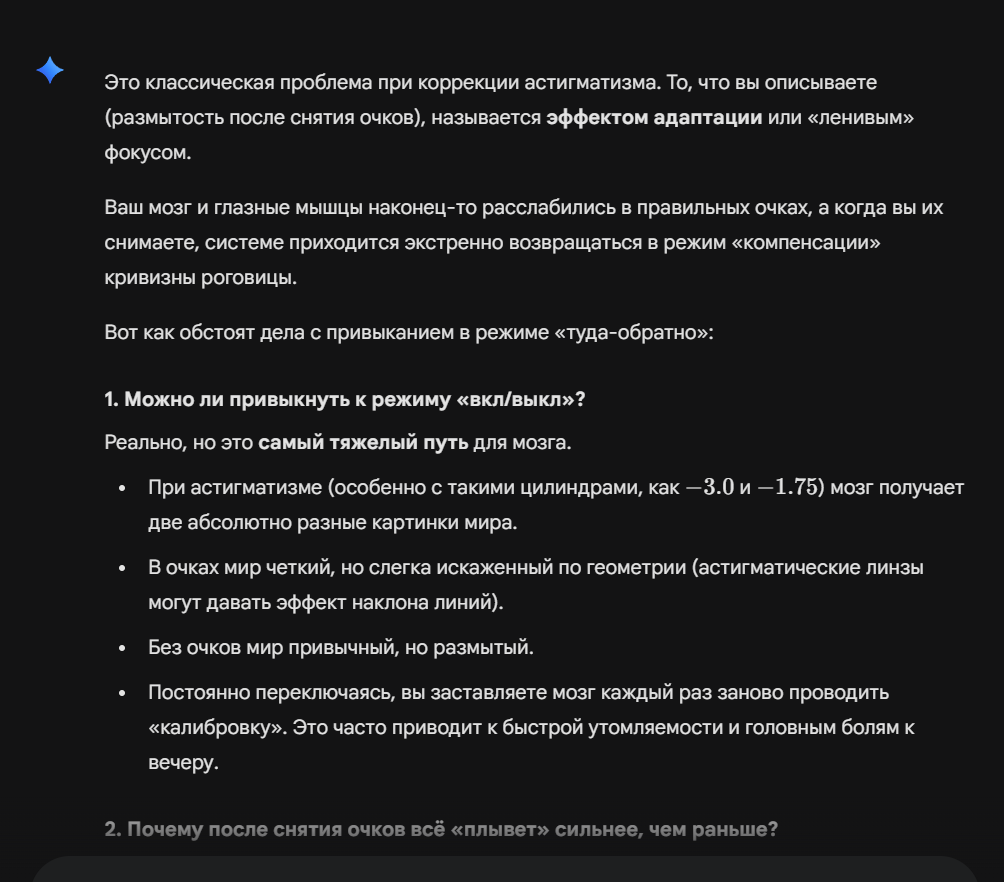 Вчера был у офтальмолога и оказалось что глаз мой за 5 лет сильно сплюснулся, таким образом исказив геометрию пространства, но мозг адаптировался это восстанавливать. И теперь когда я надеваю очки и вижу все предметы реально - мозг продолжает по привычке их искривлять и мне они кажутся кривимы. Тоесть я беру телефон - а он треугольный. Ну.. пиздец.