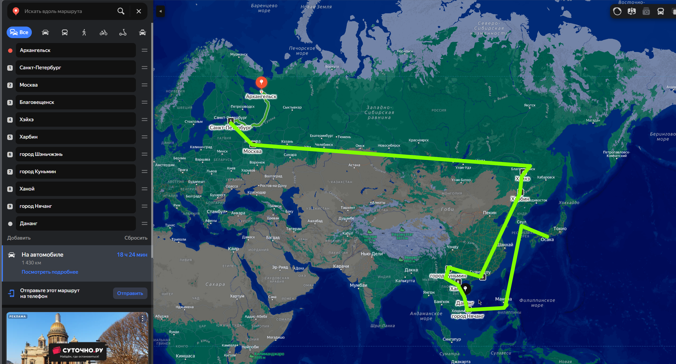 Ну и по вечерам планирую маршрут. Больше нравиться планировать и размышлять о поездке, чем ехать. Пока составил такой маршрут, вряд ли хватит денег на японию и корею, это так, бонус.