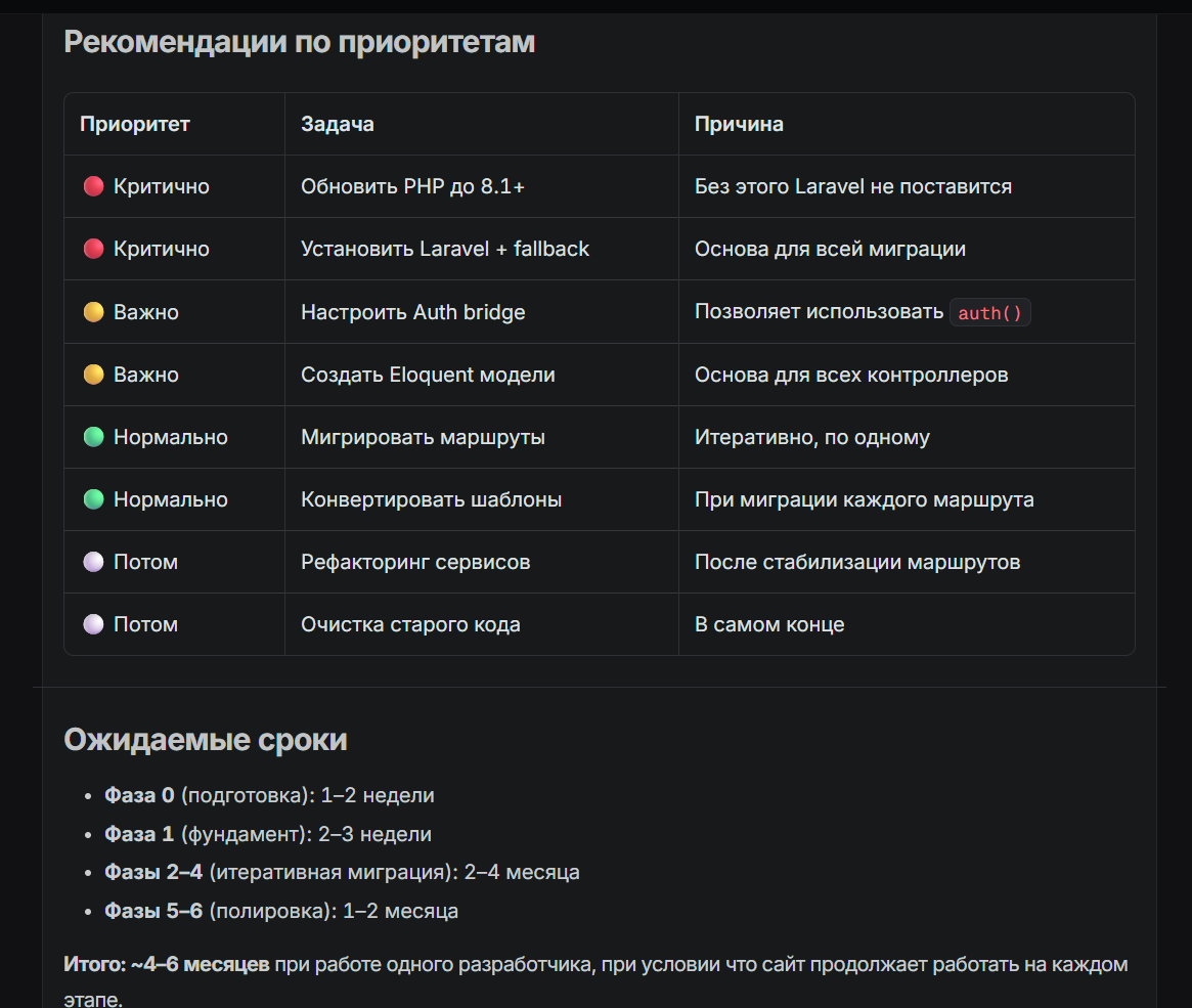 Теперь осталось перевести код с php7.4 на php8.3 и тогда уже можно установить Laravel13 и типа... как то настроить в папке самописного проекта что он будет инициализироваться и делать fallback на старый код если роут не найден. И постепенно поглощать самописный проект перенося роуты и логику. Попробовать тоже с Иишкой это шаг за шагом реализовать.