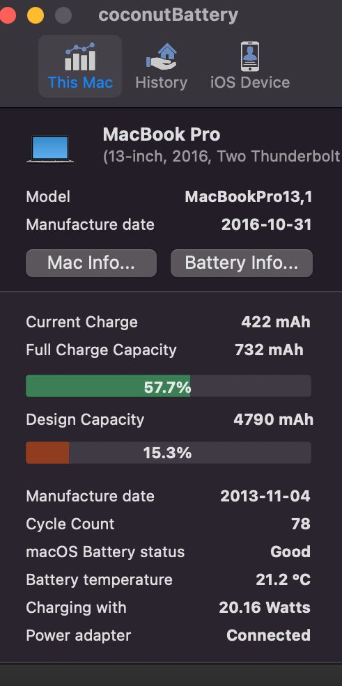 Так. Сегодня писать не о чем, ничего за сегодняшний день не произошло. Ну так, вкратце. С утра купил макбук late 2016 pro без тачбара за 300 евро. Давно хотел себе личный макбук, тем более учебный хромбук хоть и работает долго, но крайне тормозной и даже иногда крутит видео с пропусками кадров. Продавец, милая русскоговорящая женщина за 40 обещала меняный ссд и новый акб. Ну, я конечно же поверил и взял без особой проверки домой. Хотя и настаивал на чеках, которые мне обещали найти после работы. Уже дома, пока слушаю лекцию, думаю дай параллельно почищу ноут от грязи, да поставлю нужный софт и уже тогда обратил внимание, что время до полной зарядки около трёх часов от стандартного адаптера. Ну, думаю что пиздит мне этот счётчик и всё там будет нормально. Количество полных зарядок было 72 штуки, ну я и подумал, что нужно накатить последние обновы чтобы он пришёл в норму. И действительно, после обновы начал показывать стопроцентную зарядку. Обрадовался, начал уже от батареи накатывать файналкаты, хромоноги и так далее и хуякс - с сотки до пяти процентов за полчаса. У меня так батареи дома зимой не греют, как этот мак разогрелся, вдобавок выскочило оповещение о сервисе батареи.