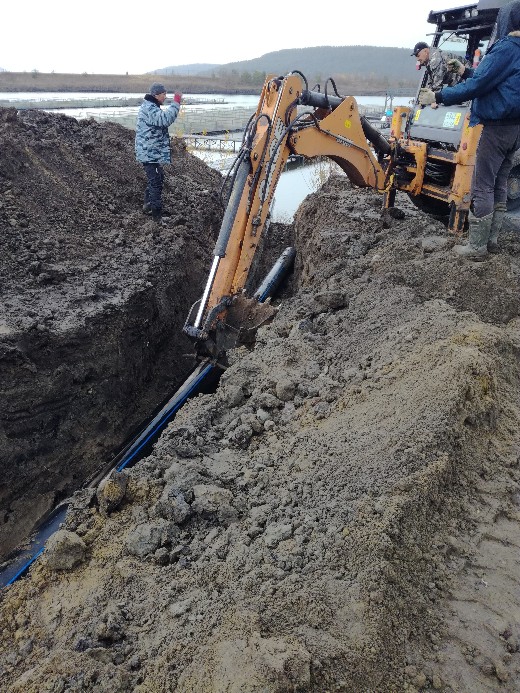 Оказывается, топором надо рубить под углом, тогда лучше рубится. Очередное открытие, спасибо Максиму. Я рубил трубу, потом мы затянули её с мороза в цех, спасённую часть, метров 40. Труба отогреется и уйдёт в траншею.