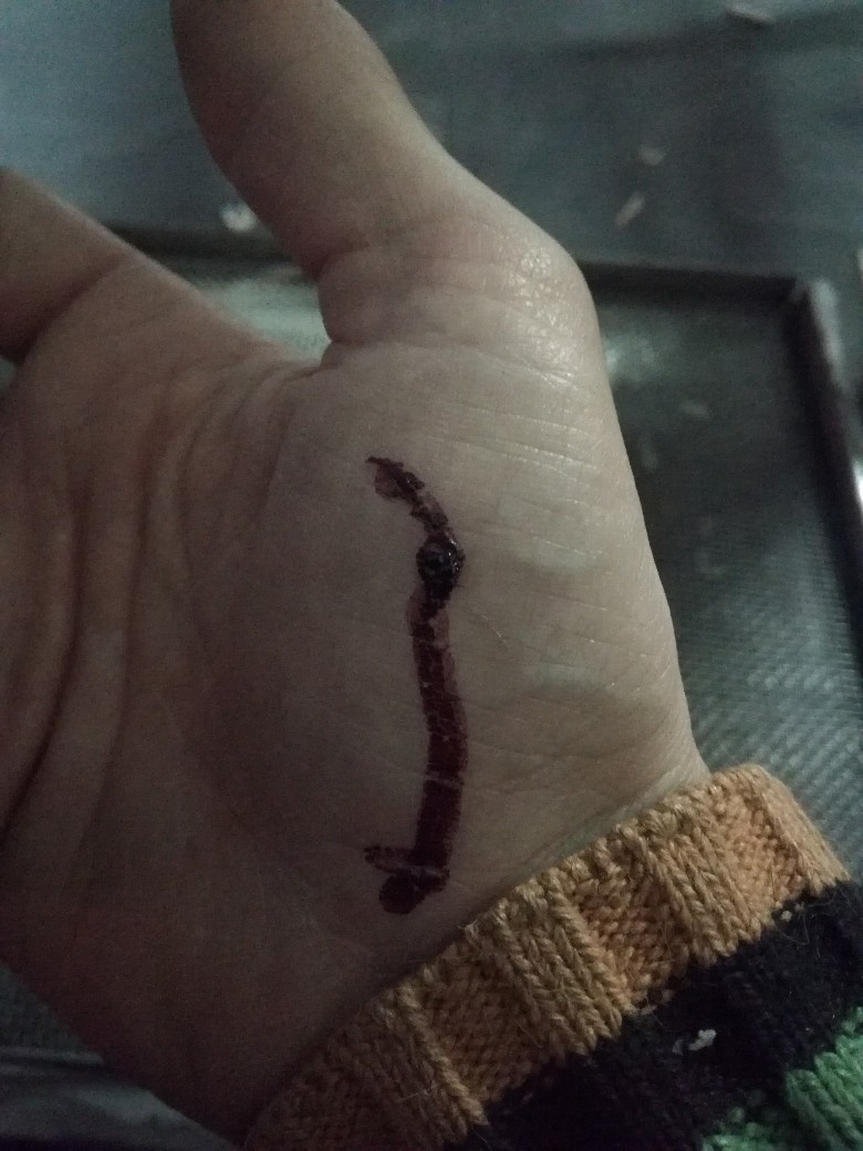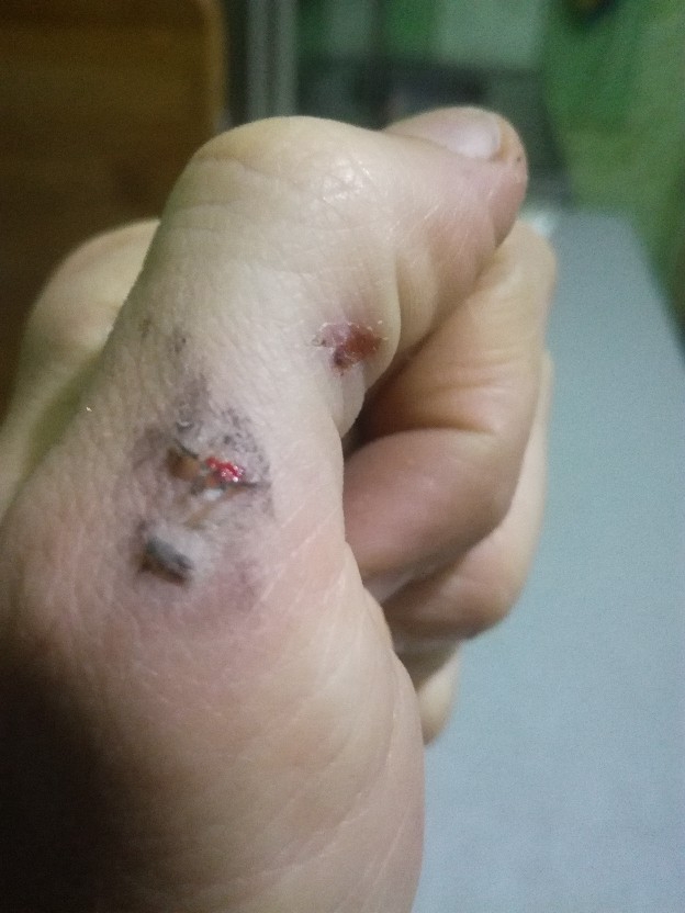 Деранул только что, когда подкидывал дрова в печку, чёрное это следы сажи. Отверстие топки достаточно широкое, но мне не хватило. Более старая ранка - это я работал шуруповёртом, уже не помню подробностей, три дня прошло, серьёзный срок.