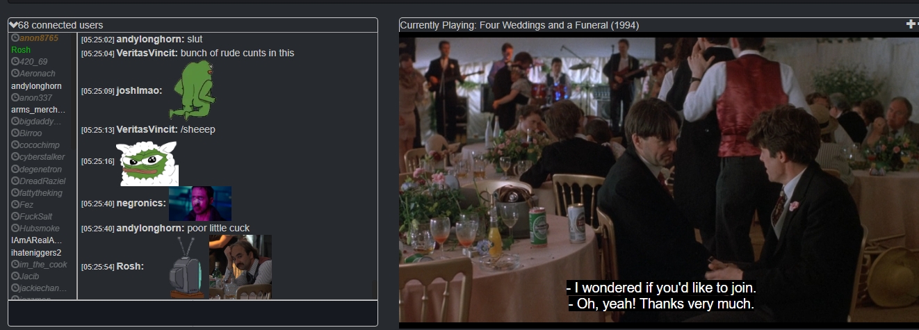 Что значит "мы смотрим"? Это стрим какой-то или каждый смотрит отдельно? Вы по ходу смотрения обсуждаете смотримое? И там нормальные обсуждения или просто анонимные пуки?