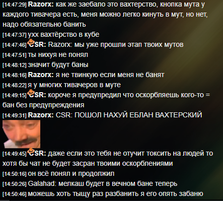 [19:44:25] Puki: CSR: давай забаним эту гнилую крысу раз и навсегда за пиздёшь [19:44:47] CSR: Galahad: да за такой пиздежь не видать ему модерки [19:45:56] CSR: Galahad: этот крыс сам удалил акк чтобы обвинить меня что я снял [19:46:04] CSR: Galahad: такое не прощу