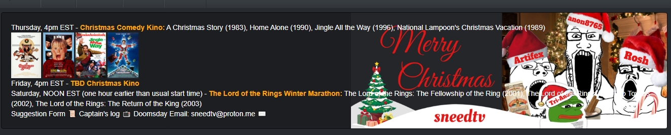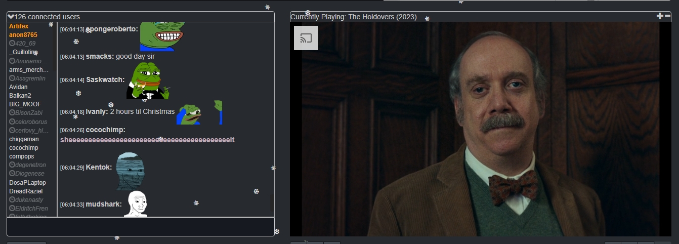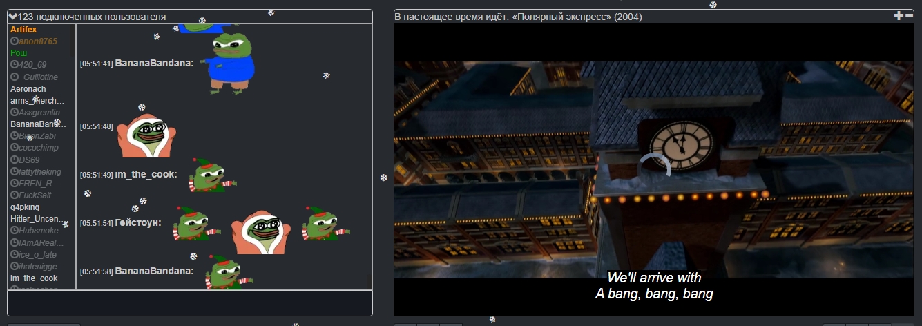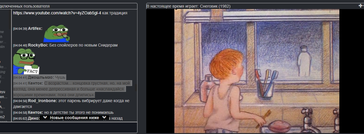 Снидач https://www.cytu.be/r/sneedtv Сейчас главный регулярный англоязычный Мувач. Ежедневно, начиная с 23.00 (иногда с 20.00) по Мск, показывает по 4-5 фильмов, объединенных в темы. Голосования нет, реквесты (сразу по 4, подобранные в соответствии с общей темой) кидаются в личку админу под ником Artifex. Есть институт ДР (Дней рождений), когда посетитель может кинуть любые 4, 5 или 6 фильмов без общей темы. Раньше назывался tv-movienight, но сменил комнату, предположительно, из-за захвата канала. Рекомендуется тем, кто хочет подучить английский. Отличается ламповой атмосферой без тивачерской токсичности и отсутствием цензуры на фильмы.