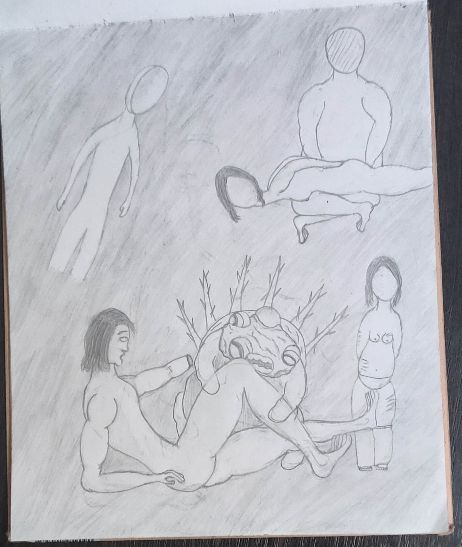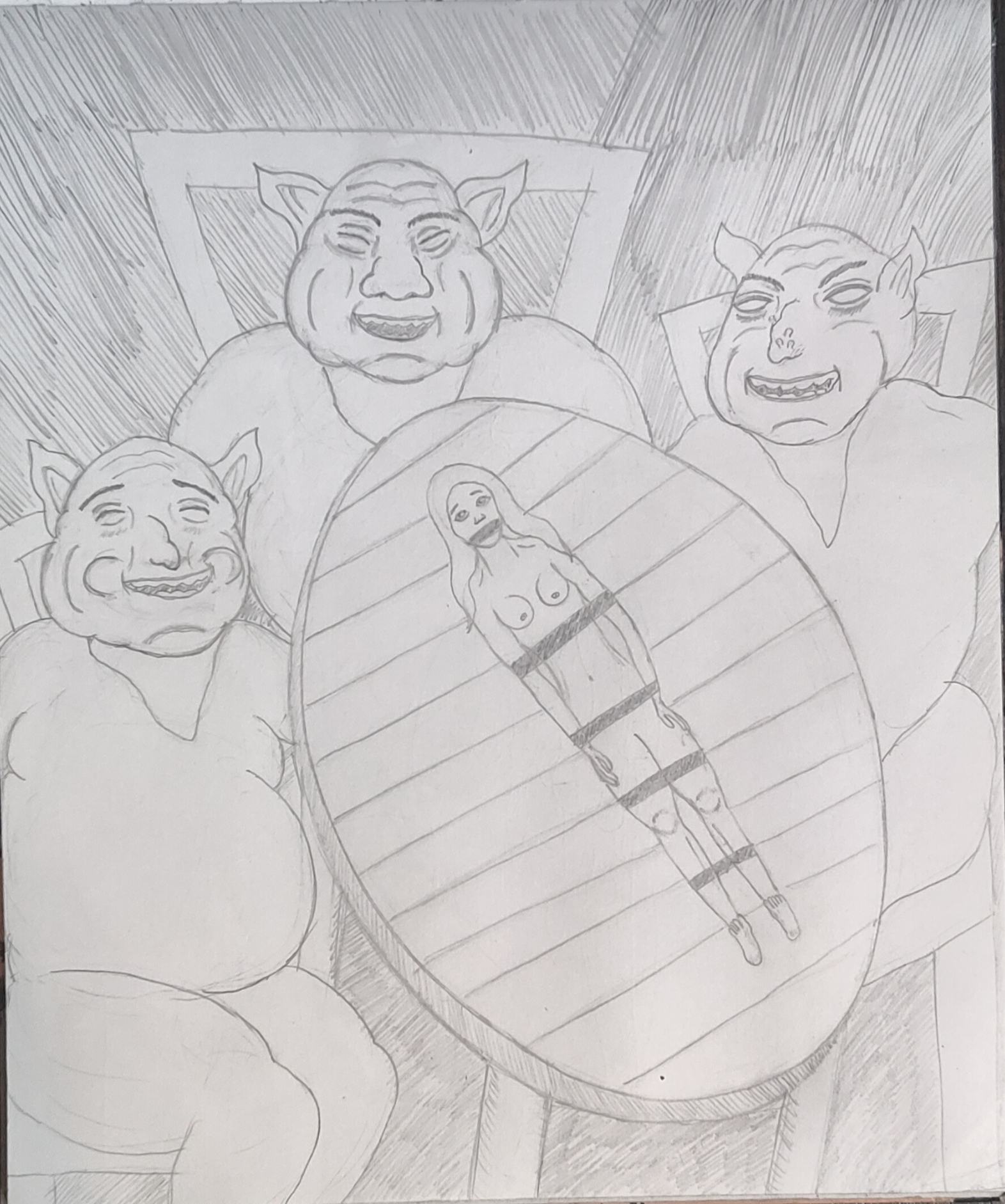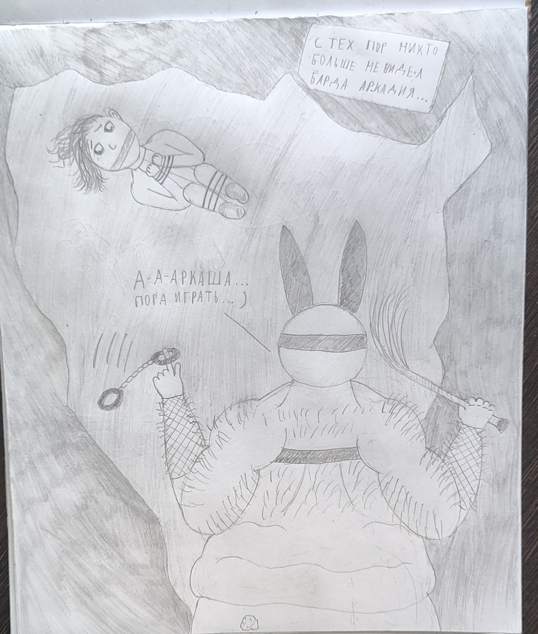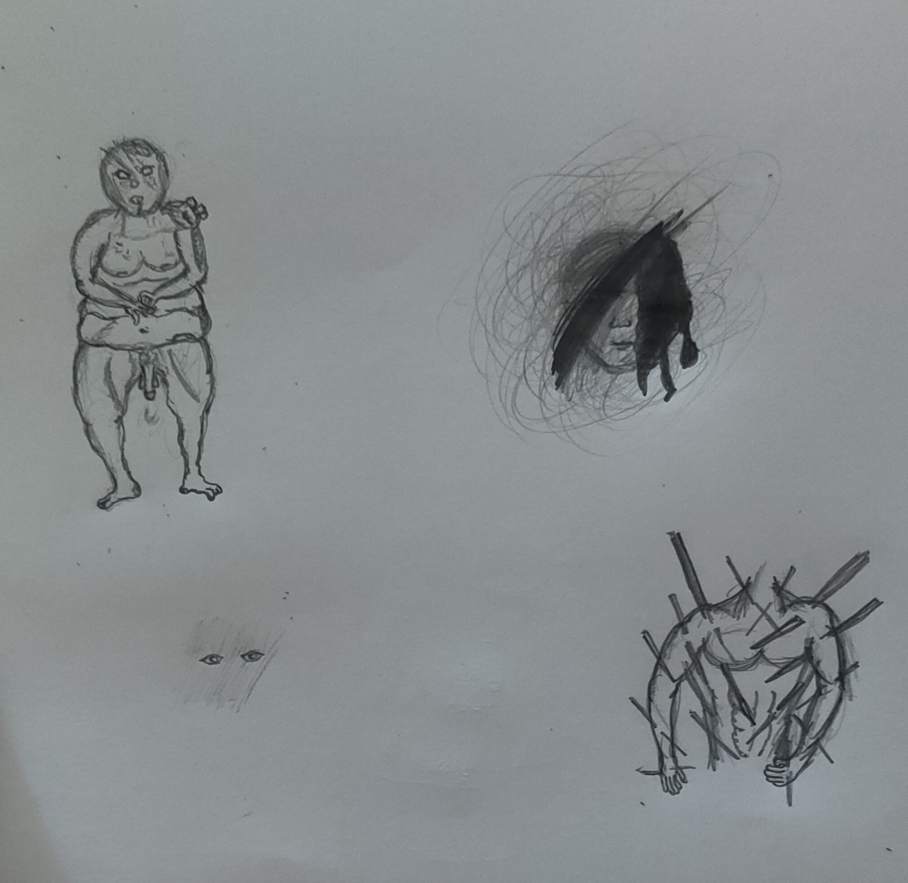 Рисовал крипи картинку. Перед работой нарисовал кровать, которая ну просто большой прямоугольники несколько прямоугольников поменьше. Слабо, не нравится. После работы приехал, покачал бицуху резинкой и гирями, рисовал толстяка с вспоротым животом. Получилась хуйня, сиськи и живот хотя бы забавные, и ноги тоже имеют свой прикол, но лицо совершенно не нравится да и сама голова в целом, кишки вообще молчу, просто насрали в живот. Правда это все же черновой вариант, да и карандаши у меня остались только ублюдские, которыми невозможно рисовать, они тупо мнут бумагу, ещё и заточить их невозможно, надеюсь, получится перерисовать получше.