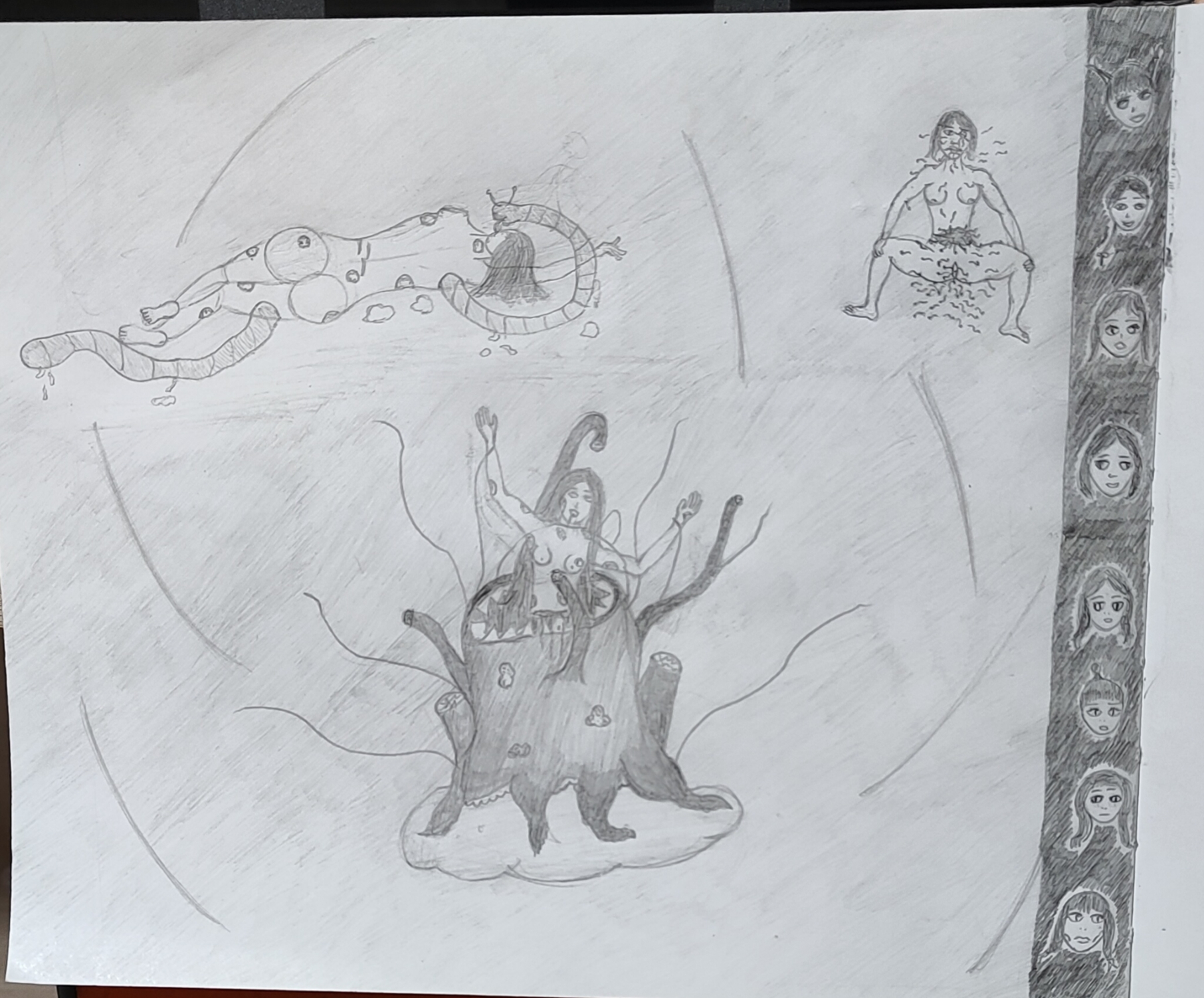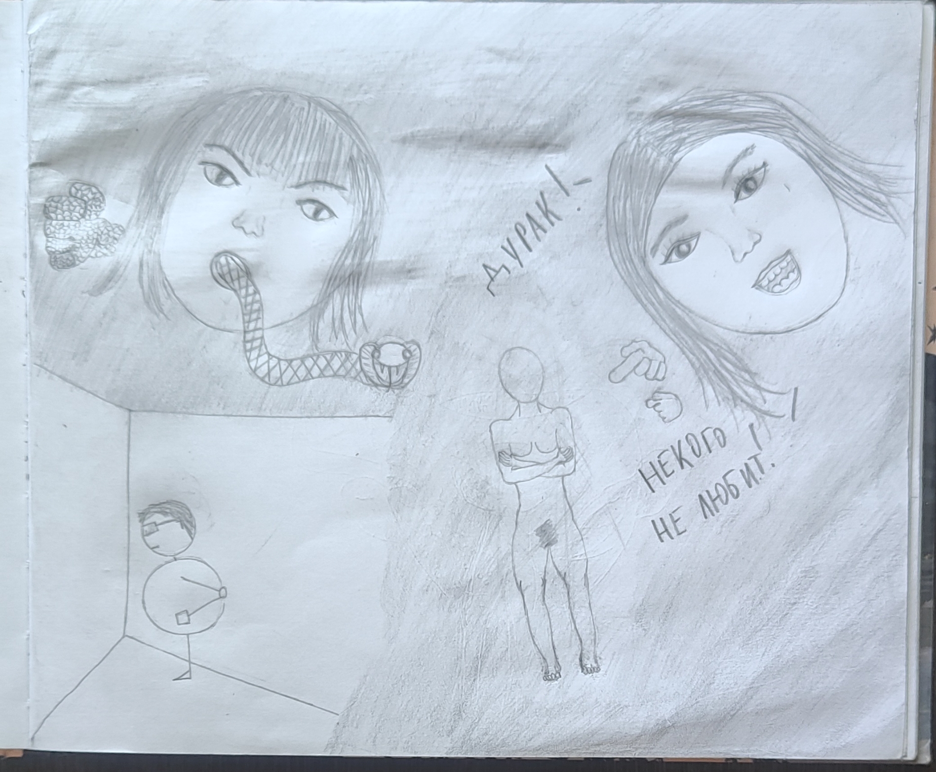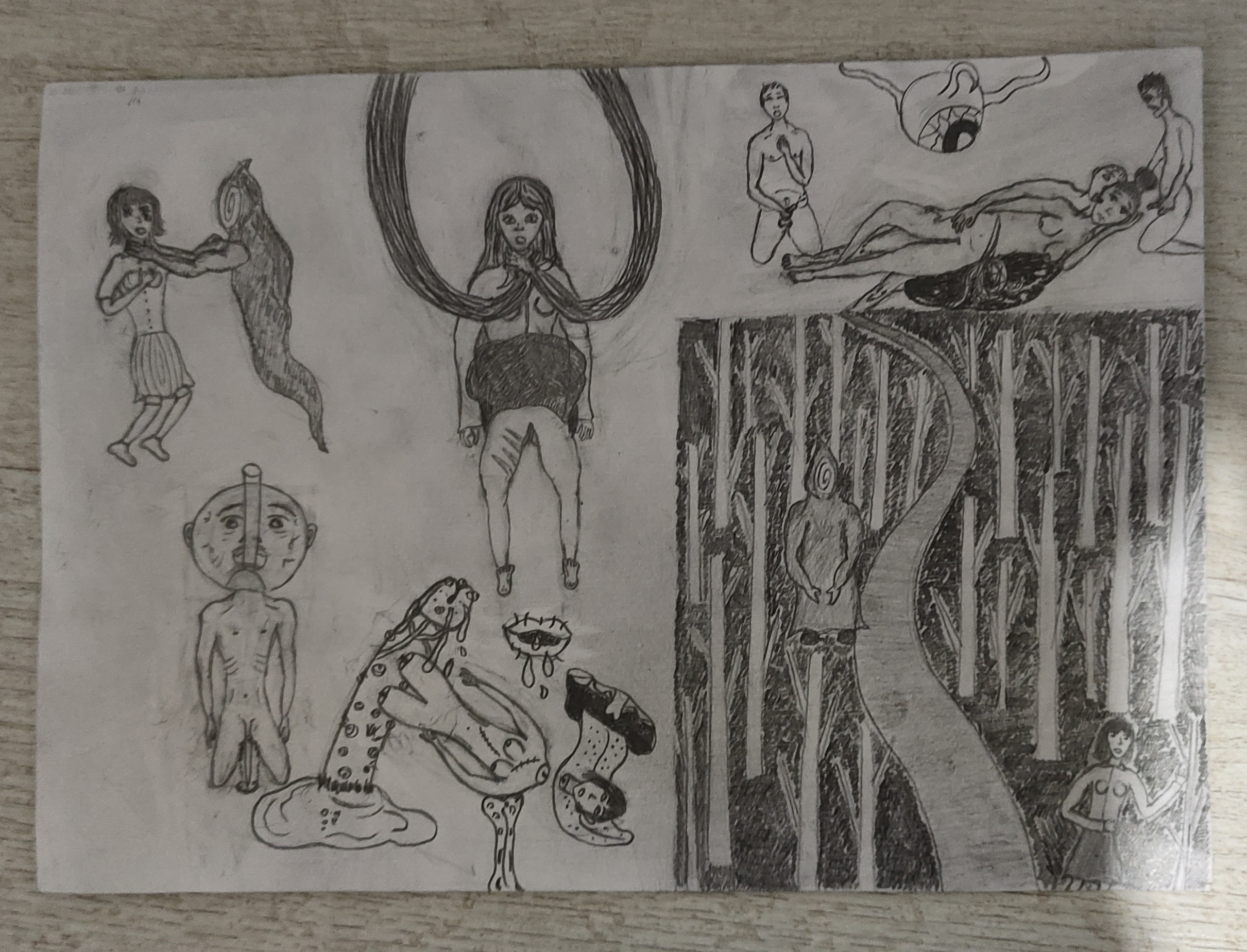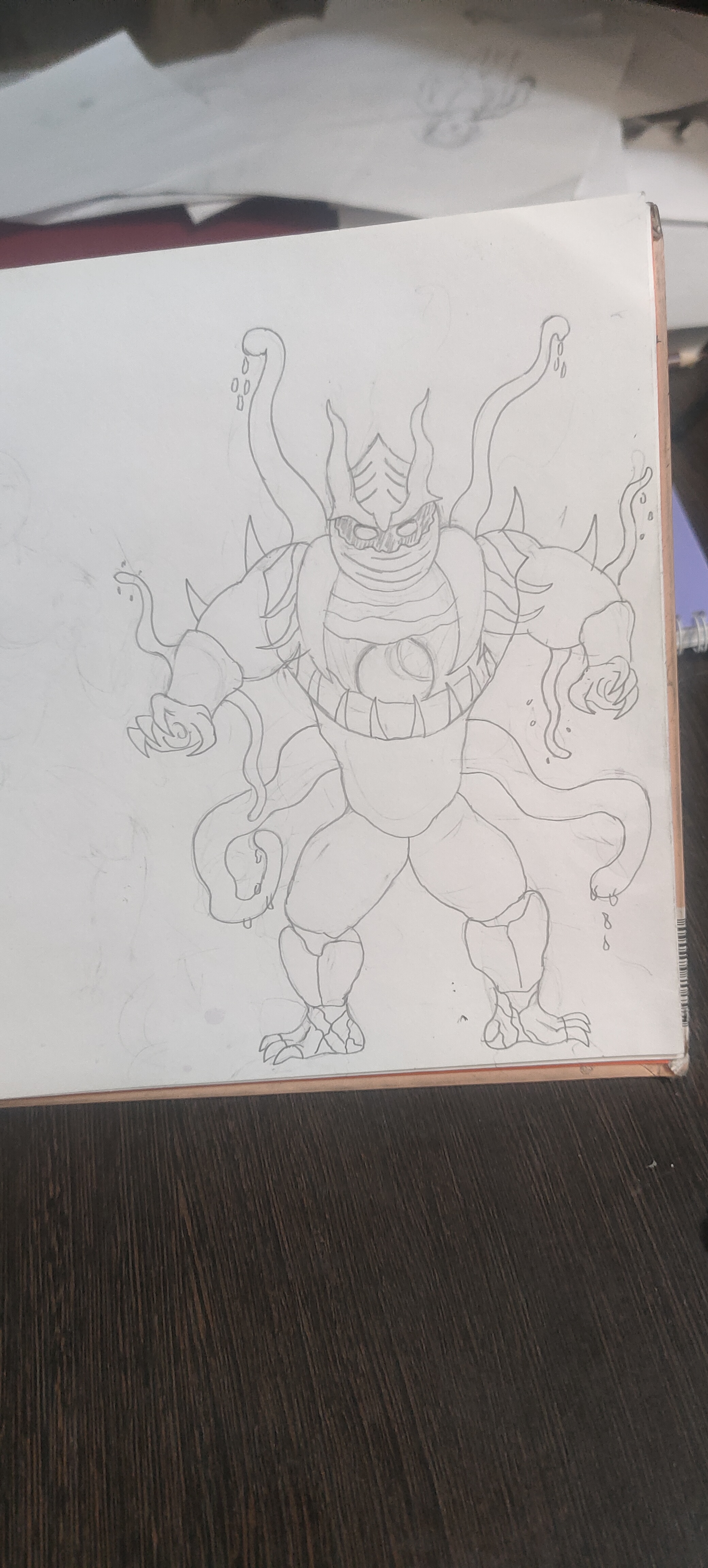 Рисовал крипи картинку. Перед работой нарисовал кровать, которая ну просто большой прямоугольники несколько прямоугольников поменьше. Слабо, не нравится. После работы приехал, покачал бицуху резинкой и гирями, рисовал толстяка с вспоротым животом. Получилась хуйня, сиськи и живот хотя бы забавные, и ноги тоже имеют свой прикол, но лицо совершенно не нравится да и сама голова в целом, кишки вообще молчу, просто насрали в живот. Правда это все же черновой вариант, да и карандаши у меня остались только ублюдские, которыми невозможно рисовать, они тупо мнут бумагу, ещё и заточить их невозможно, надеюсь, получится перерисовать получше.