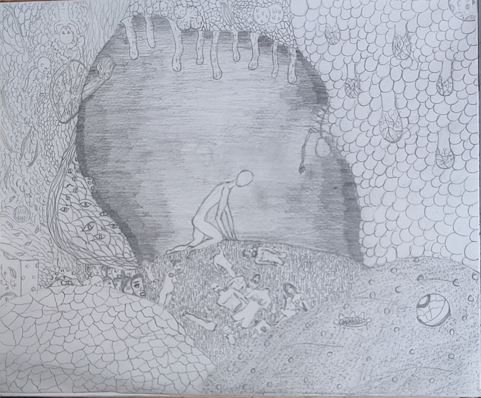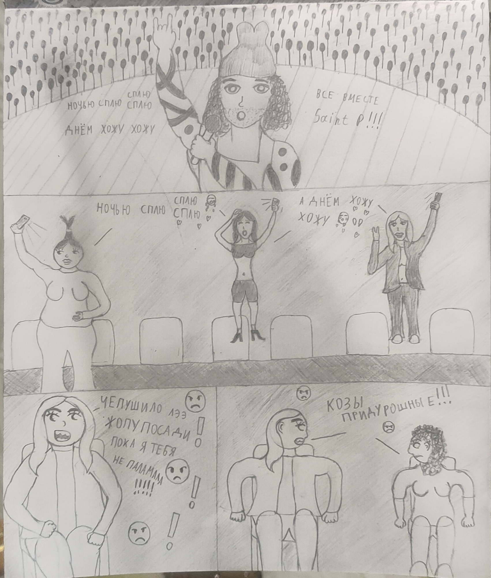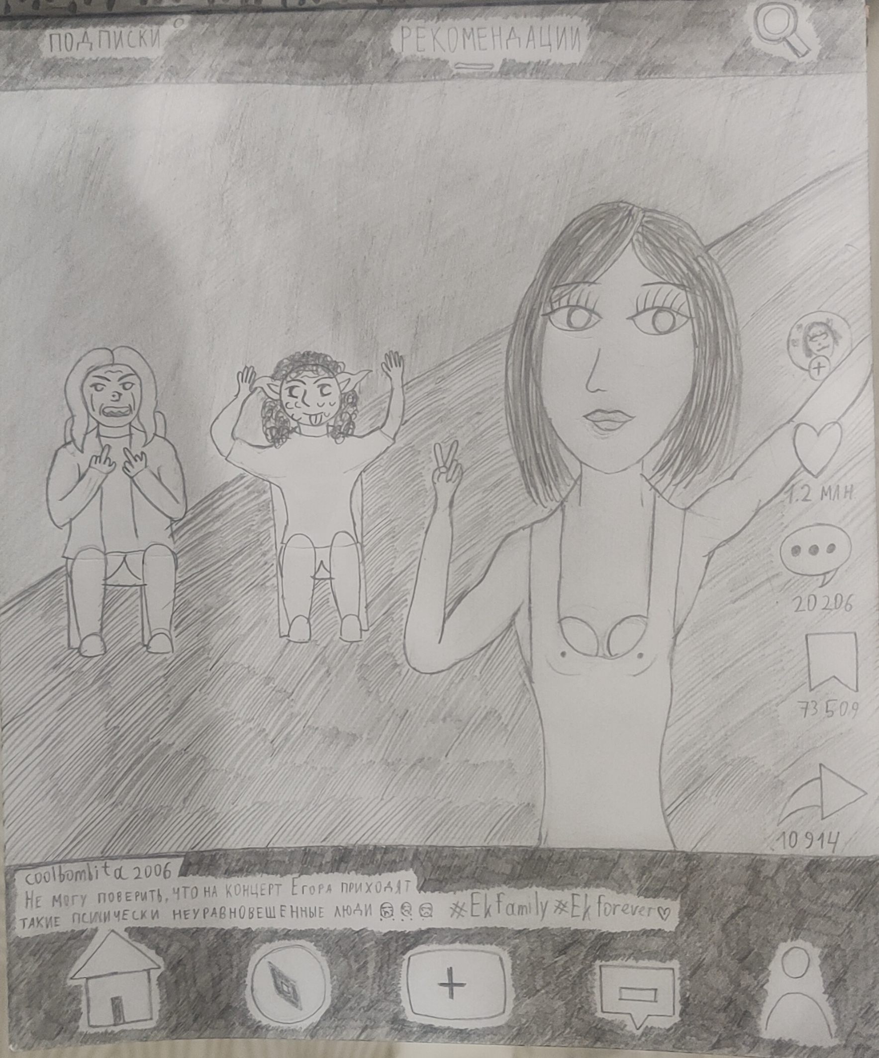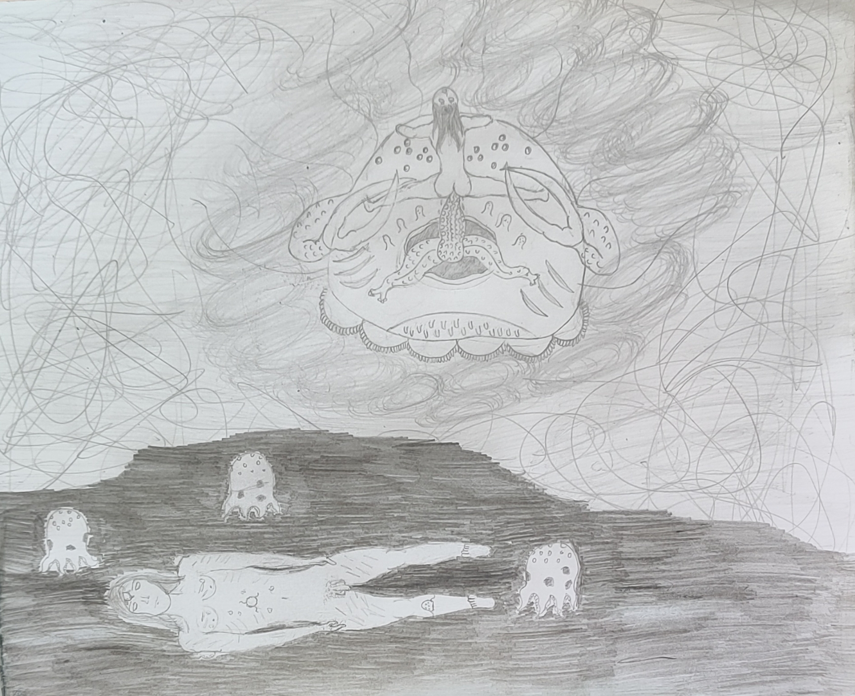 Рисовал крипи картинку. Перед работой нарисовал кровать, которая ну просто большой прямоугольники несколько прямоугольников поменьше. Слабо, не нравится. После работы приехал, покачал бицуху резинкой и гирями, рисовал толстяка с вспоротым животом. Получилась хуйня, сиськи и живот хотя бы забавные, и ноги тоже имеют свой прикол, но лицо совершенно не нравится да и сама голова в целом, кишки вообще молчу, просто насрали в живот. Правда это все же черновой вариант, да и карандаши у меня остались только ублюдские, которыми невозможно рисовать, они тупо мнут бумагу, ещё и заточить их невозможно, надеюсь, получится перерисовать получше.