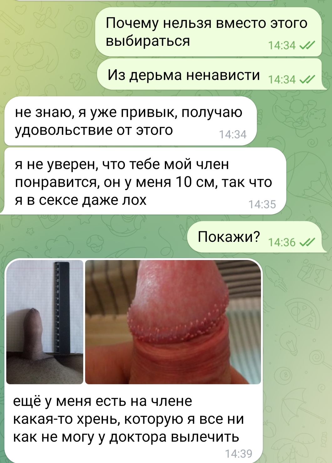 И затроллил я их плюс . Уверен ,жопы у них сгорели знатно, что какой-то очкарик шнырь прыщавый просто взял,и повернулся спиной и пошел от них, а не трепетал перед двумя упырями . Драться я тоже морально был готов, если бы не форма. Пошли нахуй, я вышел достойно из этой ситуации, причин грызть себя нет.
