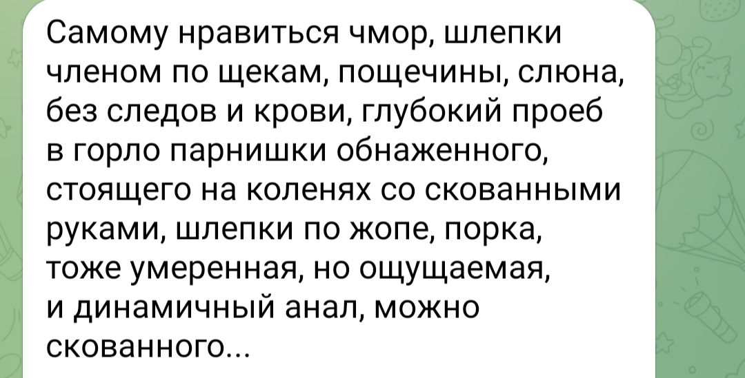 Но все это все равно для меня как акт селфхарма по сути. Я не знаю, как люди искренне ебутся мужик с мужиком, вот как он ко мне относился страстно, а я, ну для меня это просто желание быть униженным и задоминированным. Не знаю, это надо прям фембойчика фембойчика трахать, чтобы это не было сюром каким-то, но это блять и не желание ебать мужика тогда , а какая-то уродливая компенсация отсутствию секса с женщиной.