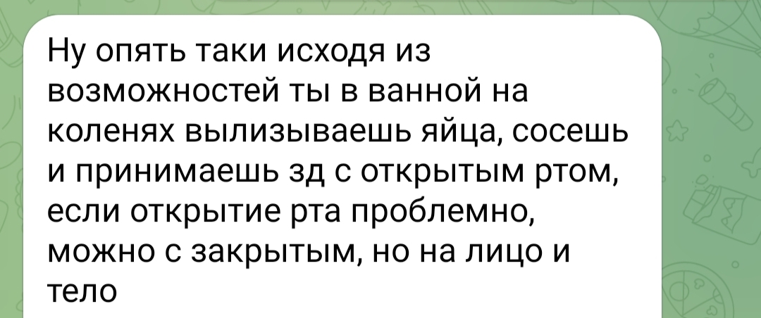 В жопу давать не понравилось, больно да и все. У него ещё сука хуй такой, не толстый, не супер длинный, но острый какой-то, конусообразный. Анальные игры приятно на уровне римминга, совсем на поверхности потыкать, но более-не, мне не нравится. Римминг мне кстати чутчут сделали, перед тем, как войти, без предупреждения причем, у меня ебало сразу вытянулось, как у арабки из конкурса красоты Папича, где она стояла улыбалась, а как отошла, сразу скукурузила мину в духе"пиздец, куда я попала, что за ебанат". Чел , ну вот ты реально хочешь лезть ртом в мое волосатое очко? Ещё когда делаешь клизму душем с открученной насадкой, потом выдрищиваешь это все в унитаз, а потом слышишь, как партнёр делает то же самое, это не особо возбуждающе действует. И вообще у меня после этой клизмы весь день теперь живот раздутый и болит.