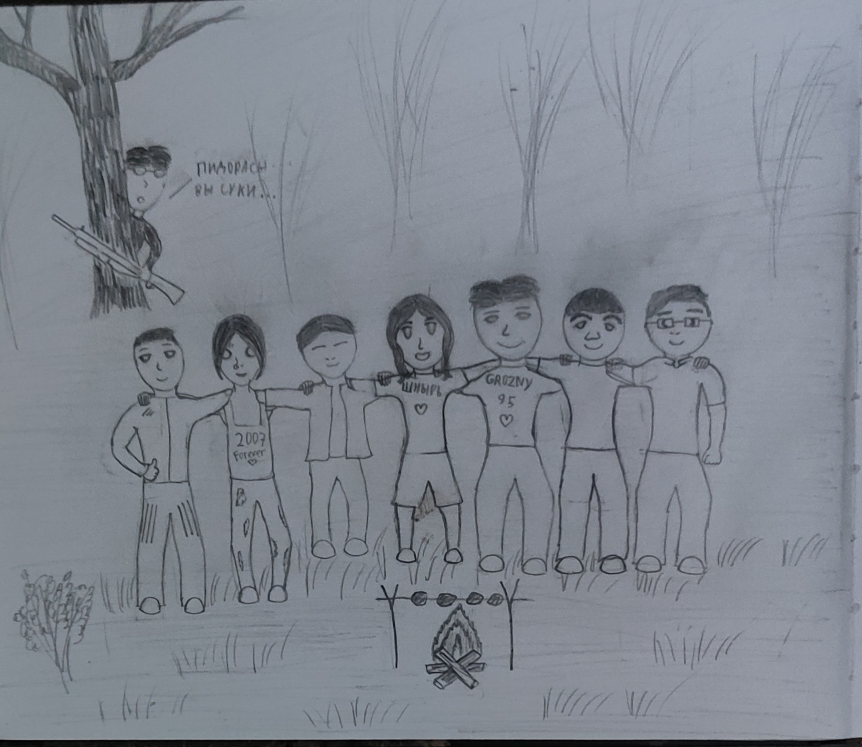 Потом поехал в лес с друзьями за грибами. Грибов мы не собрали, буквально пару грибов нашли и все. Вышли к шалашу, стали разводить костер.