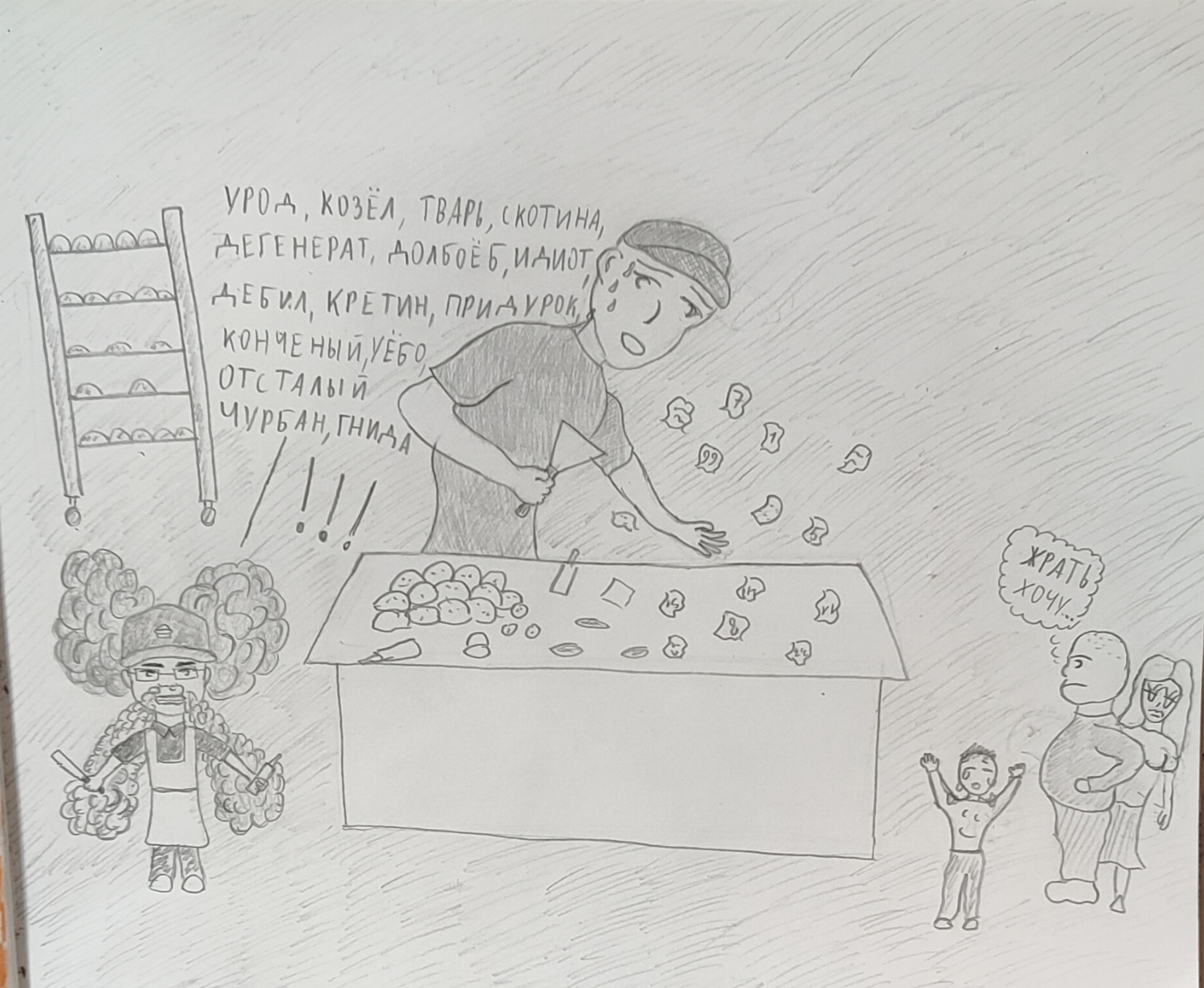 Ещё до этого он вроде на своем тоже чето на меня пиздел другому узбеку ,мол, заказов сколько, а это стоит булки режет .
