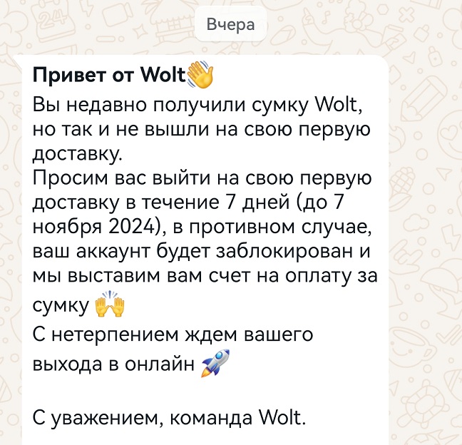 Хотел бы пояснить один нюанс - хоть в шапке треда и заявлена тема проституции, но никаких шлюхо-отчётов тут не ждите и всяких треш-историй тоже не будет. по крайней мере я надеюсь на это Моя цель - избавиться от этой дурости, а не продолжать этим заниматься. А вообще мне уже пора работать, надо отдавать взятый вчера кредит. Недавно устроился курьером в Wolt и до сих пор ни разу не вышел на работу. Пока ездил в этот ебучий офис, сильно простыл, поэтому недели две валялся сычевал с больным горлом. А вчера вот уже пришла смс-ка пикрелейтед - уже угрожают блокировкой аккаунта, пиздос. Так что сегодня в первый раз попробую покурьерить в этом самом вольте, посмотрим что за доставка такая.